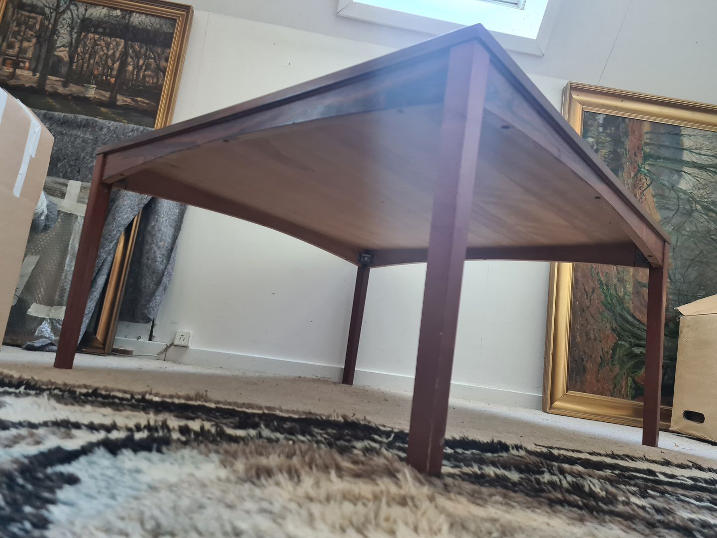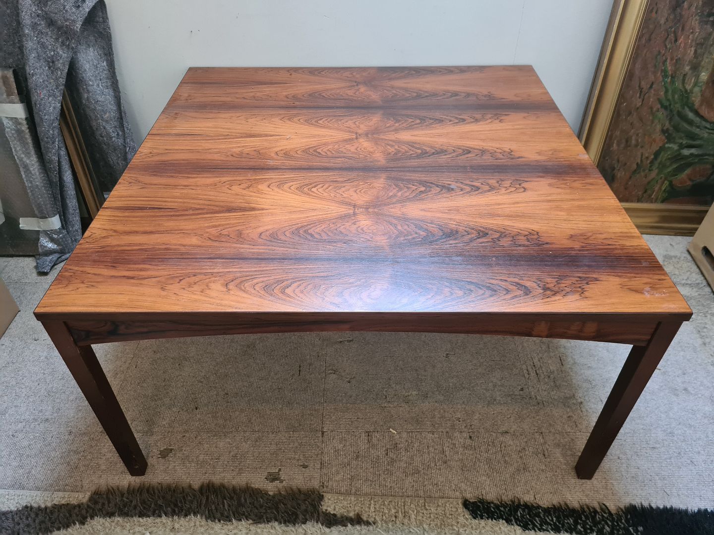 Dansk Design kvadratisk sofabord fra 1970'erne i palisanderfinér. Fremstår pænt og velholdt uden de store brugsspor. Højde 54 cm. Længde 100 cm. Bredde 100 cm. Emne nummer: 80453