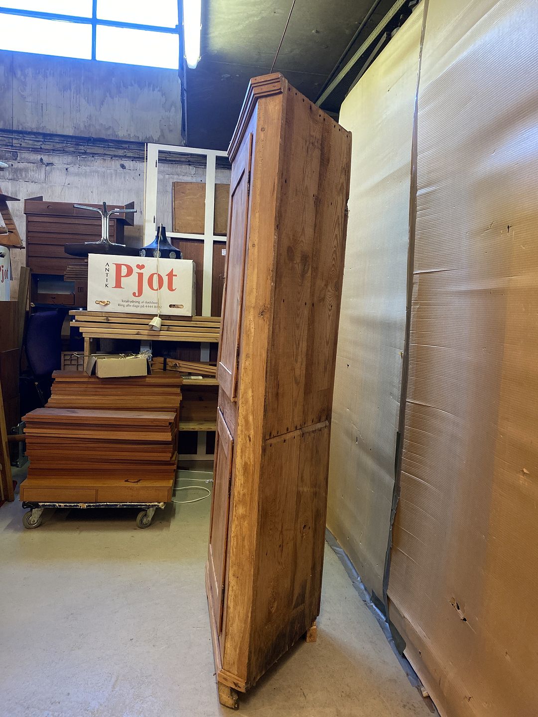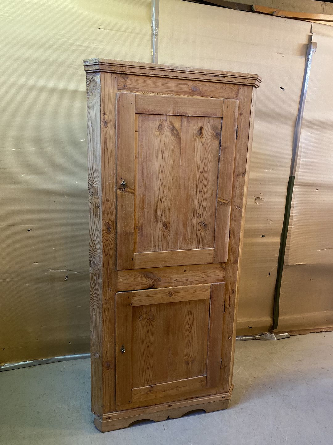 Hjørneskab i massivt fyrretræ, fra 1900erne. Det har brugsspor, defekter og mangler bagben. Højde 192cm Bredde 90cm De to dybder 54cm Emne nummer: 75012
