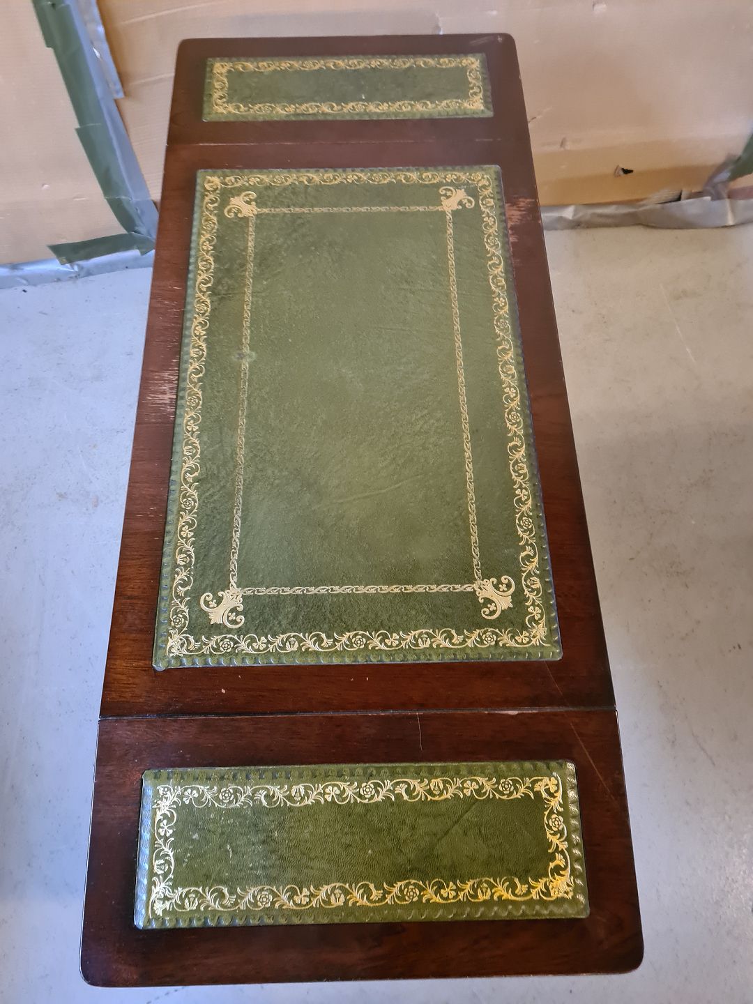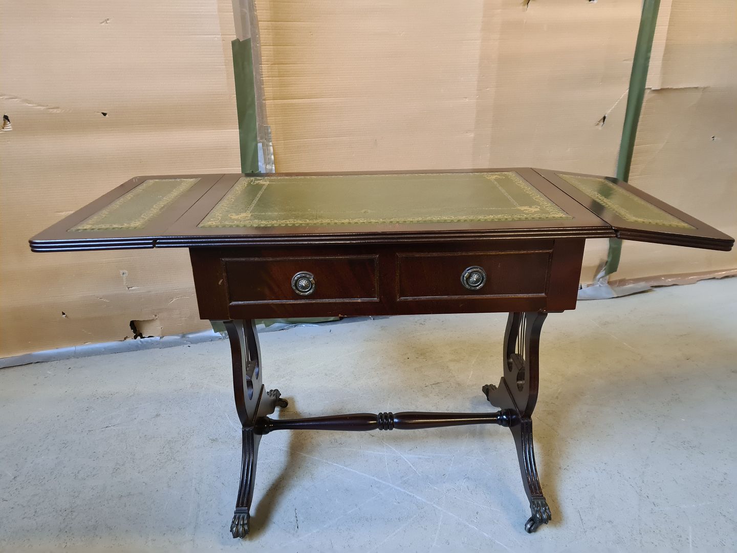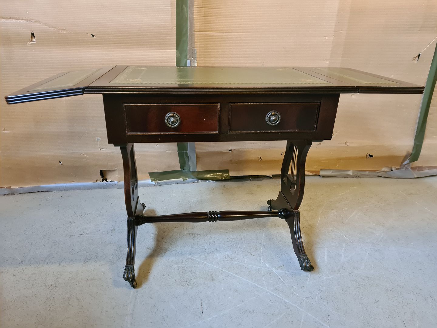Lampebord i fineret mahogni, fra 1980erne. Det har brugsspor og den ene udtræks-pind er knækket. Højde 56cm Bredde 39cm Længde 61cm Længde med klapper 96cm Emne nummer: 75034