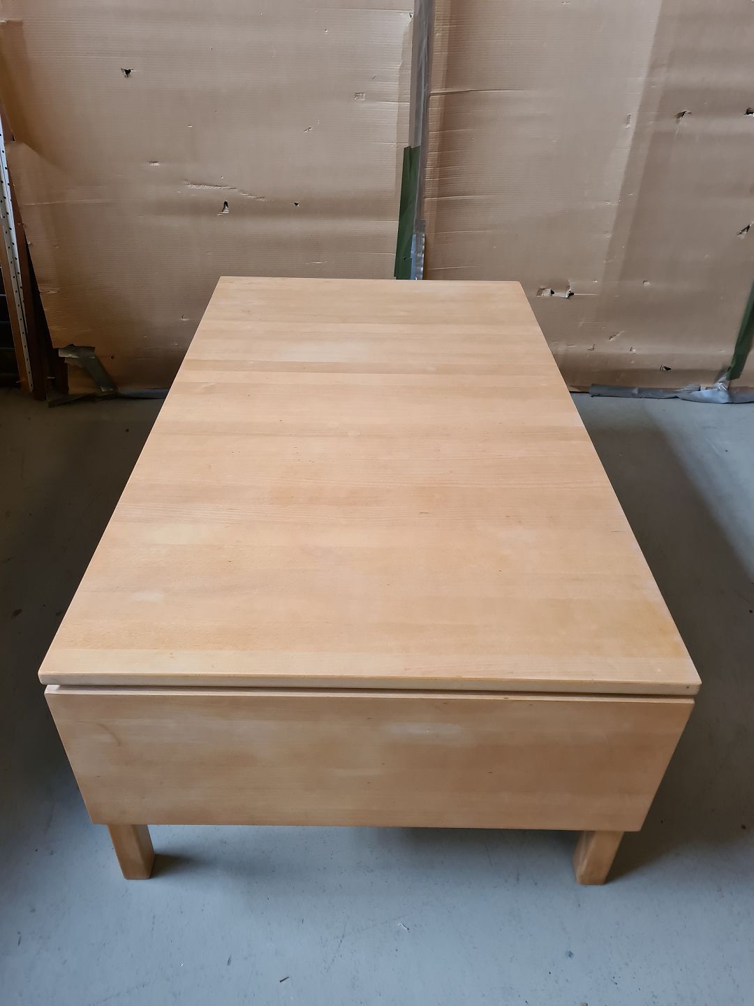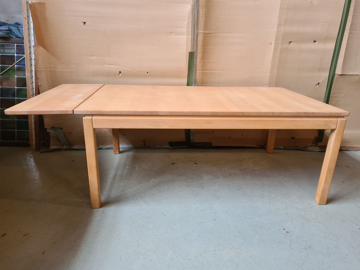 Brødrene Andersen sofabord i massivt bøgetræ, fra 2010erne. Det har brugsspor og bordpladen trænger til at blive peppet op. Højde 55cm Bredde 80cm Længde 136cm Længde med klap 166cm Emne nummer: 75100
