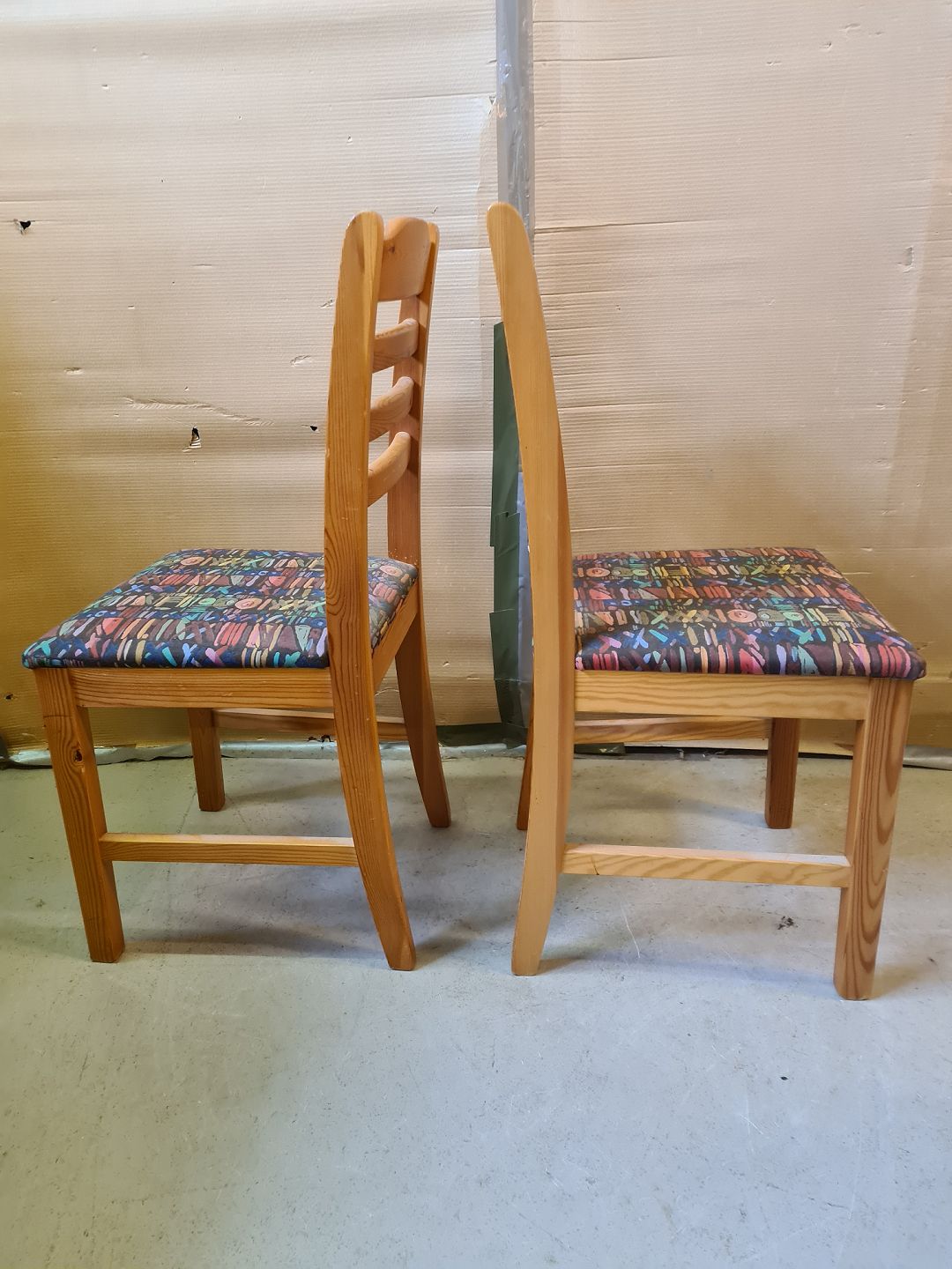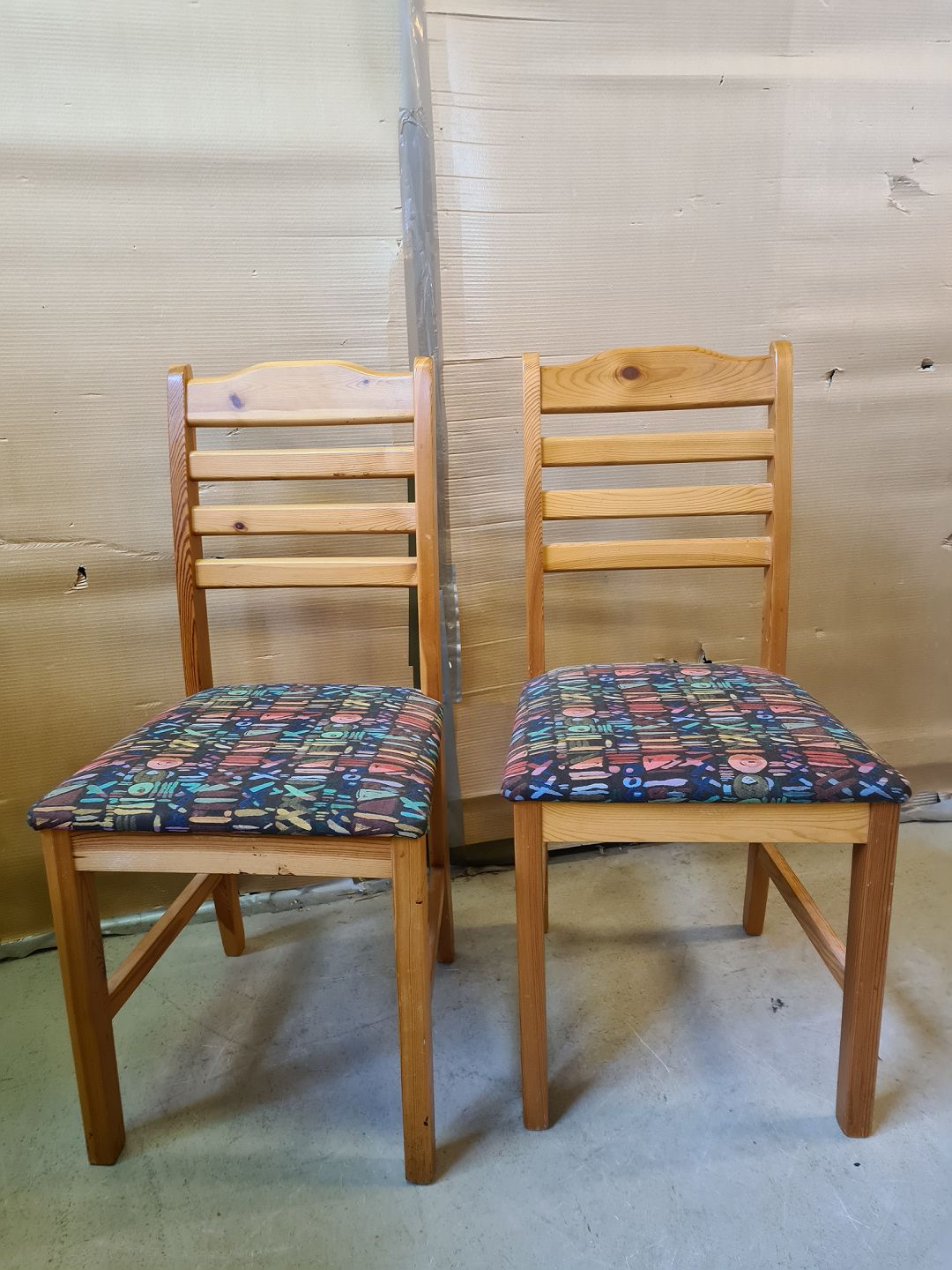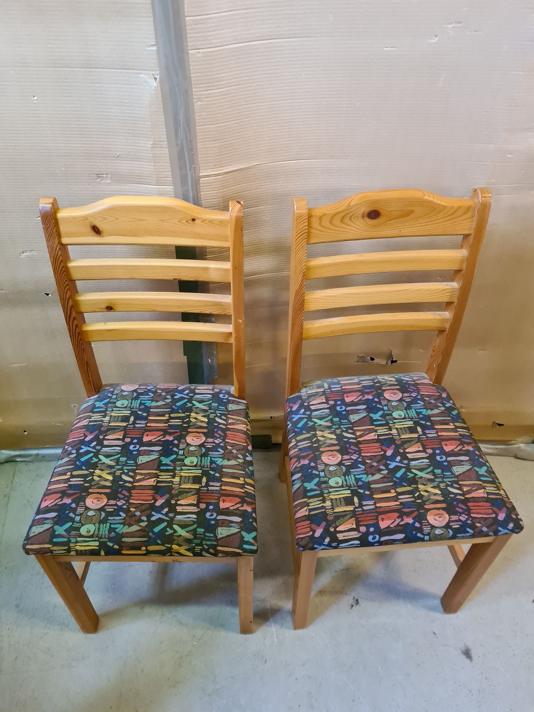 2 Stole i massivt fyrretræ, fra 1980erne. De har brugsspor. Ryghøjde 94cm Sædehøjde 46cm Emne nummer: 75264