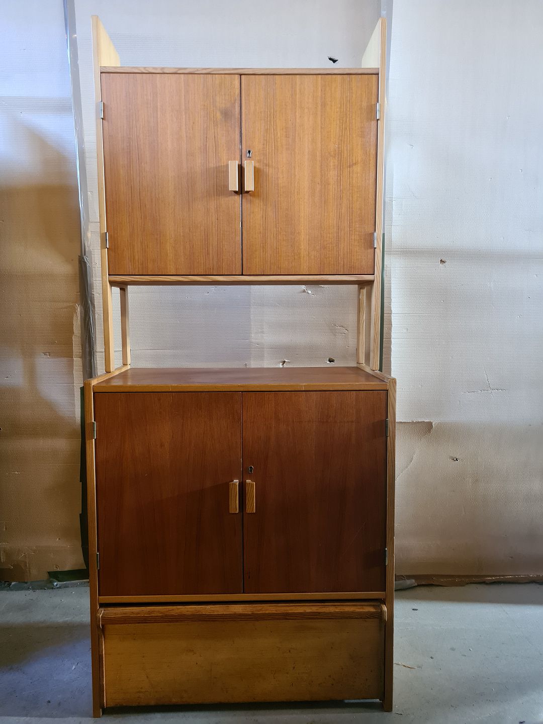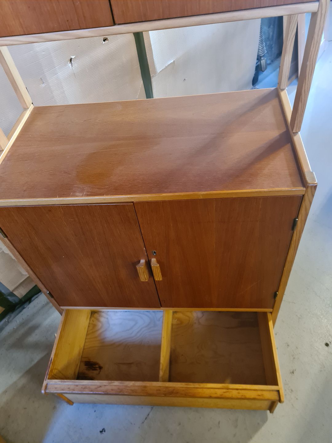 Reolsektion i massivt fyrretræ og fineret teaktræ, fra 1960erne. Den har brugsspor. Højde 187cm Bredde 80cm Dybde i bunden 43cm Dybde i toppen 25cm Emne nummer: 75330