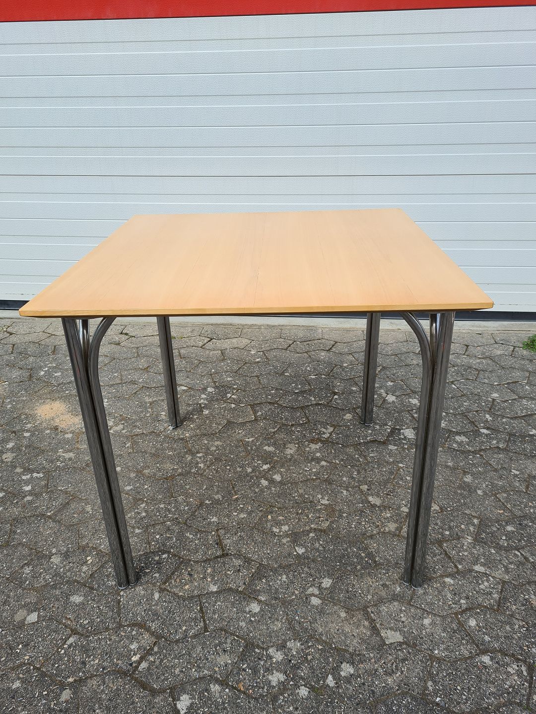 Nanna Ditzel bord i fineret bøgetræ og stål, fra 1990erne. Det har brugsspor. Højde 72cm Bredde 80cm Længde 80cm Emne nummer: 75448