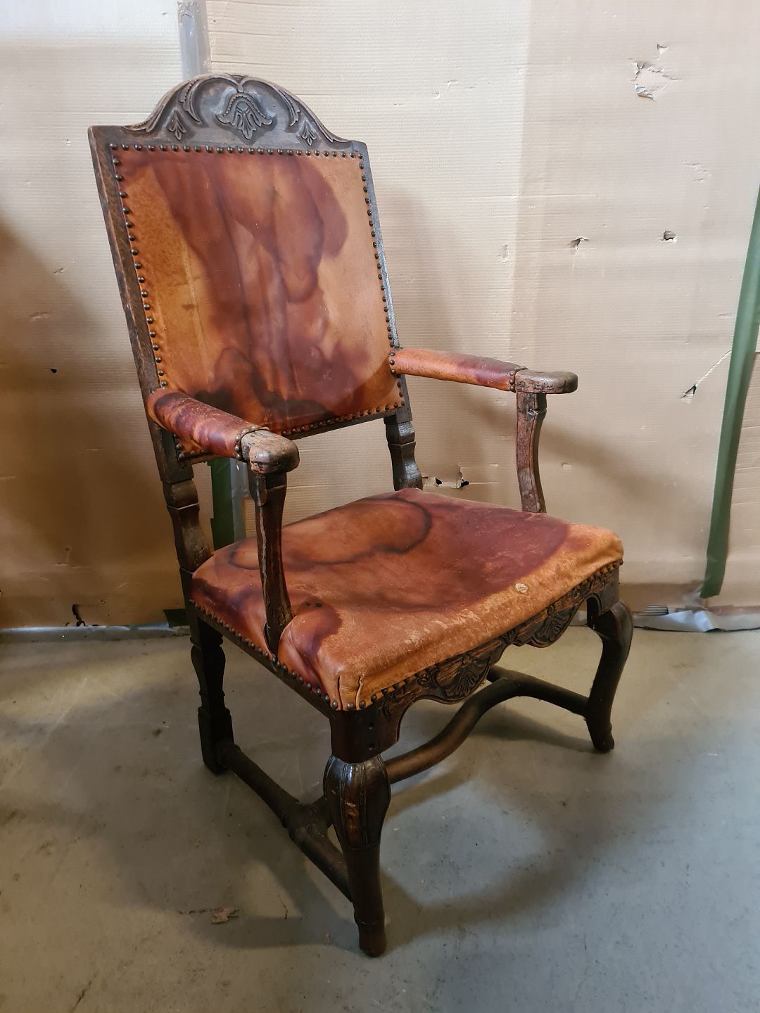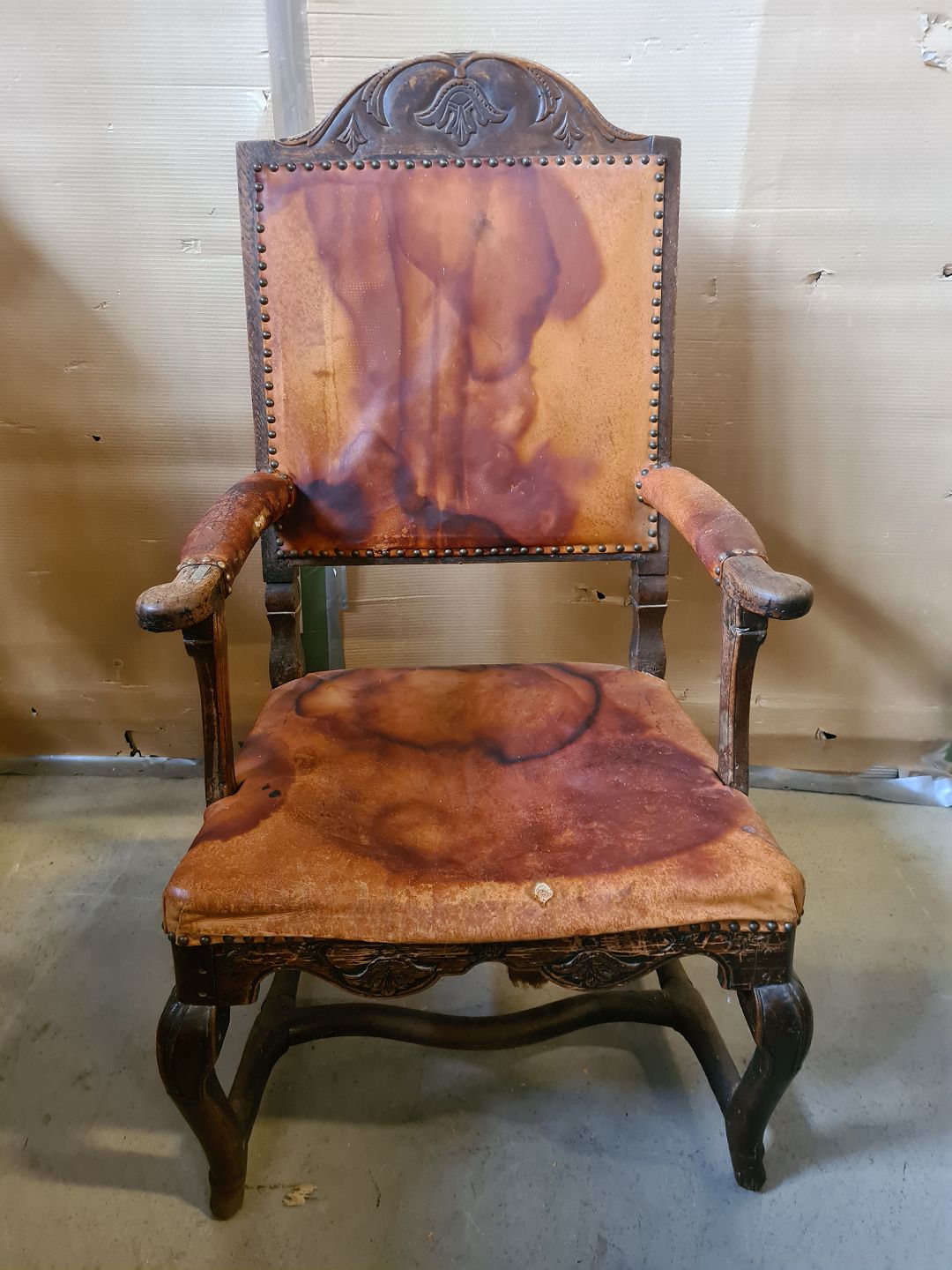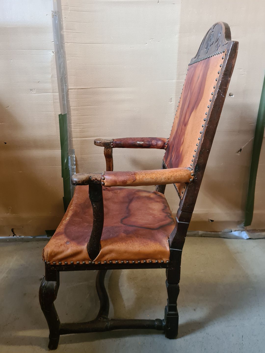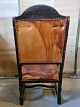 Antik amstol i egetræ, fra 1850erne. Denhar brugsspor og defekt læderbetræk. Ryghøjde 114cm Sædehøjde 41cm Emne nummer: 75493