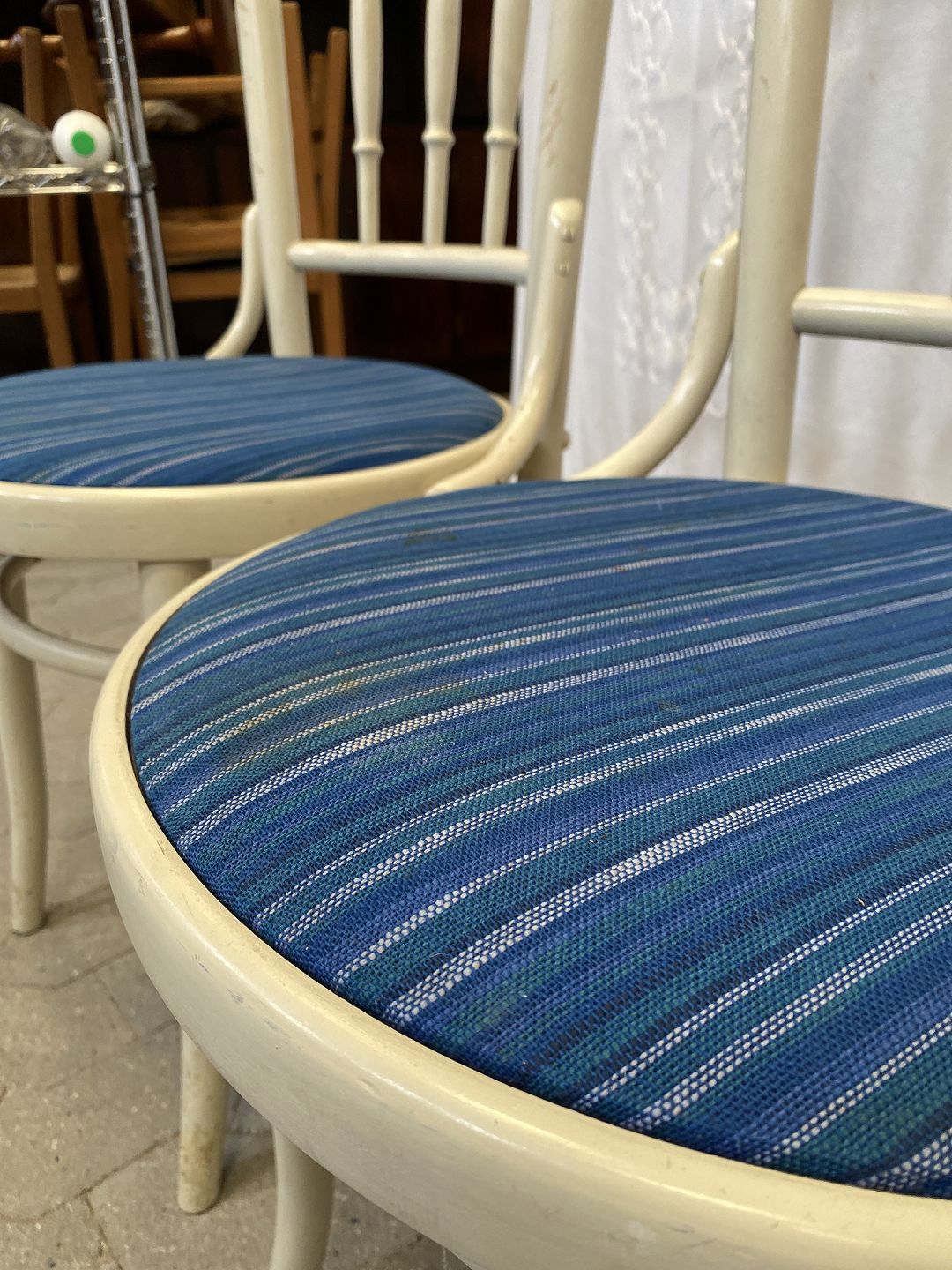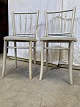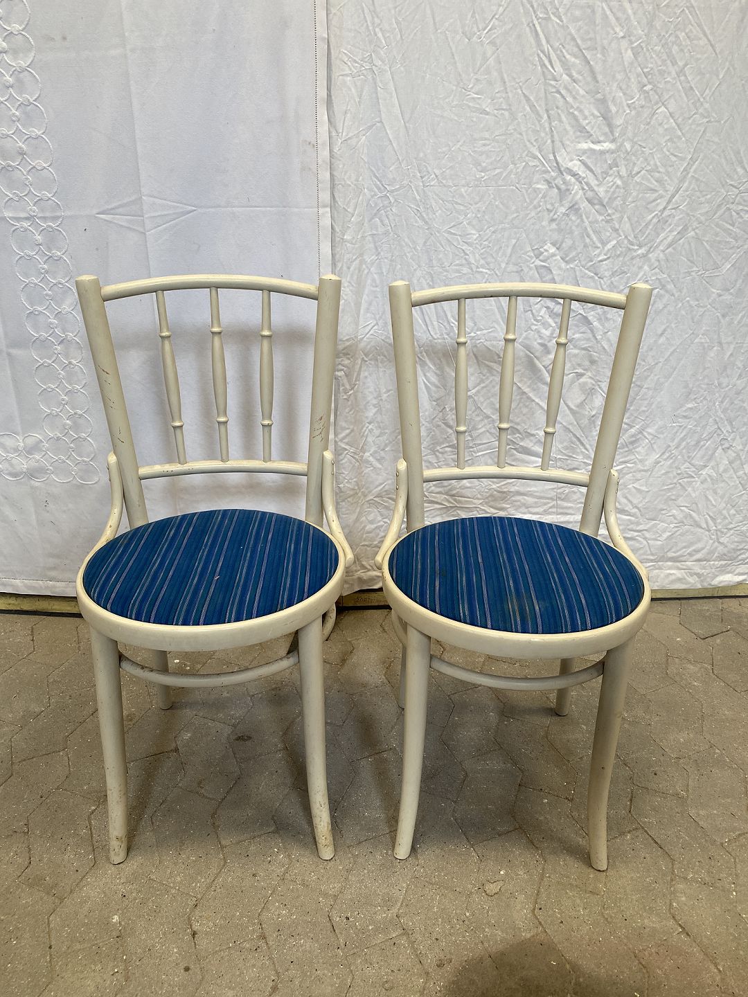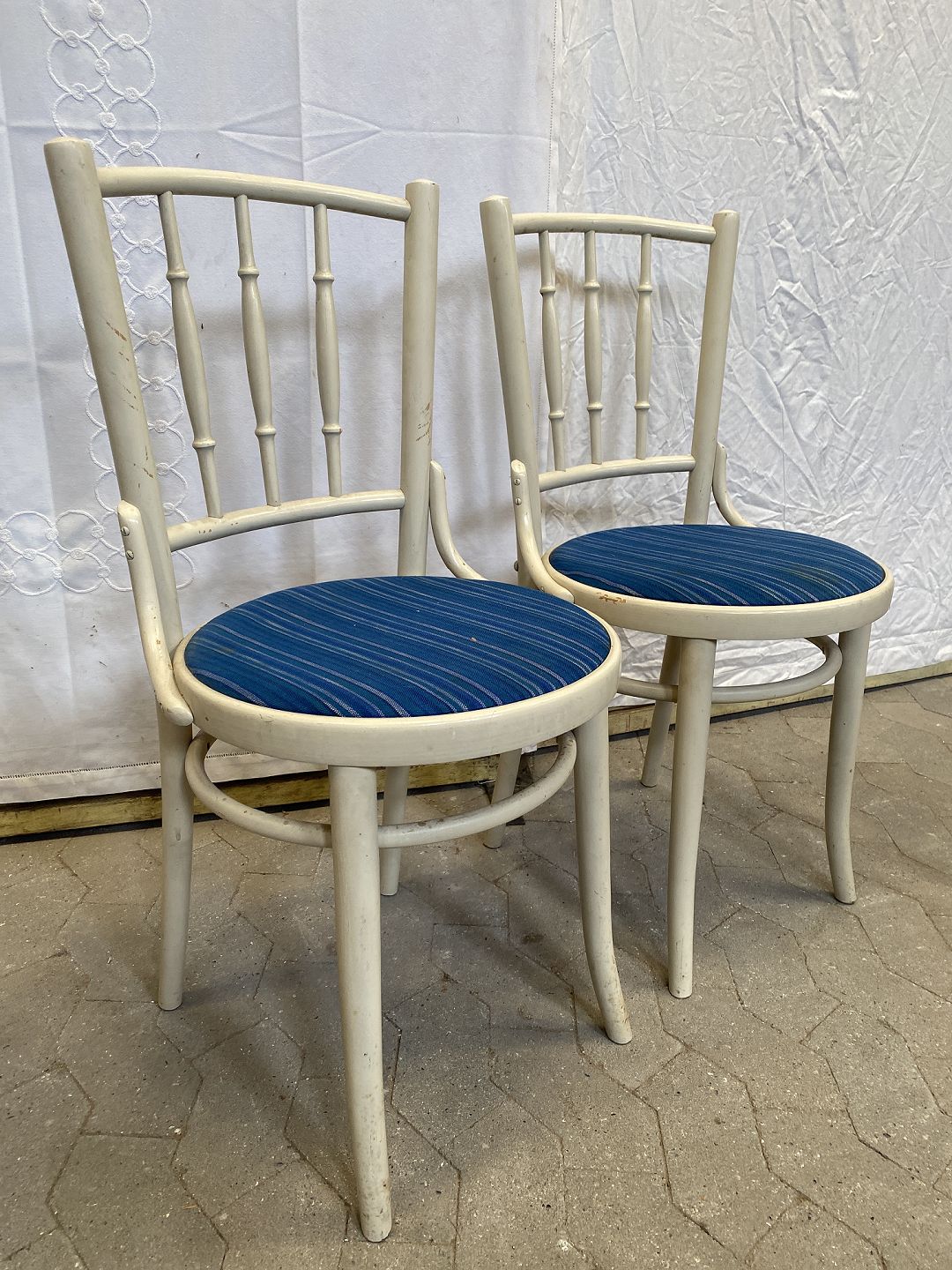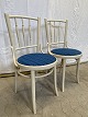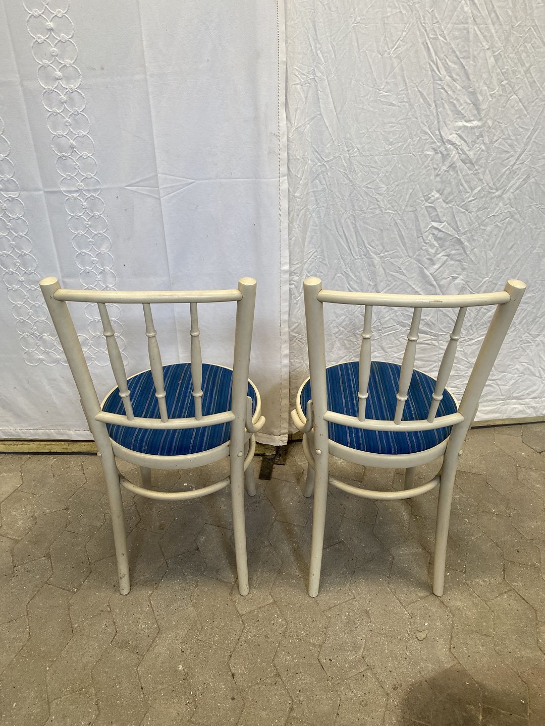 2 hvidmalede stole med blåt betræk. Højde: 88cm Bredde: 45cm Dybde 41 Sædehøjde: 47cm Emne nummer: 90642
