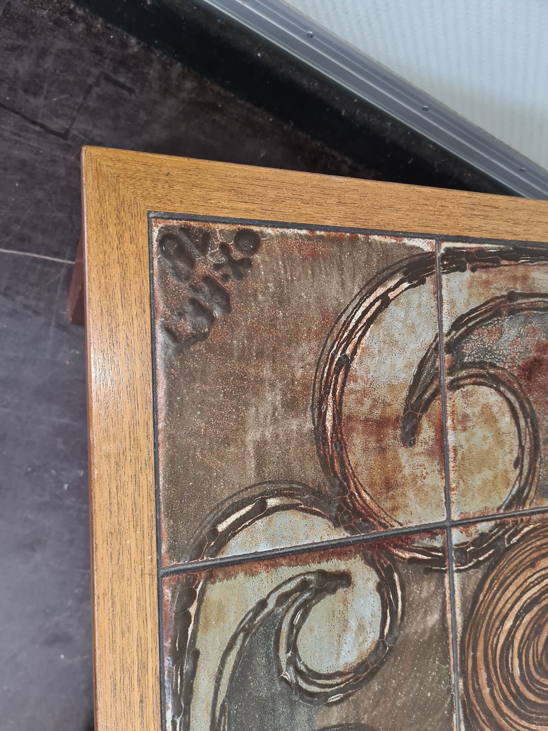 Sofabord fra 1970´erne i eg og med kakler. Bordet fremstår godt og stabilt dog med en lille flænge i en af kaklerne. (billede) Emne nummer: 80467