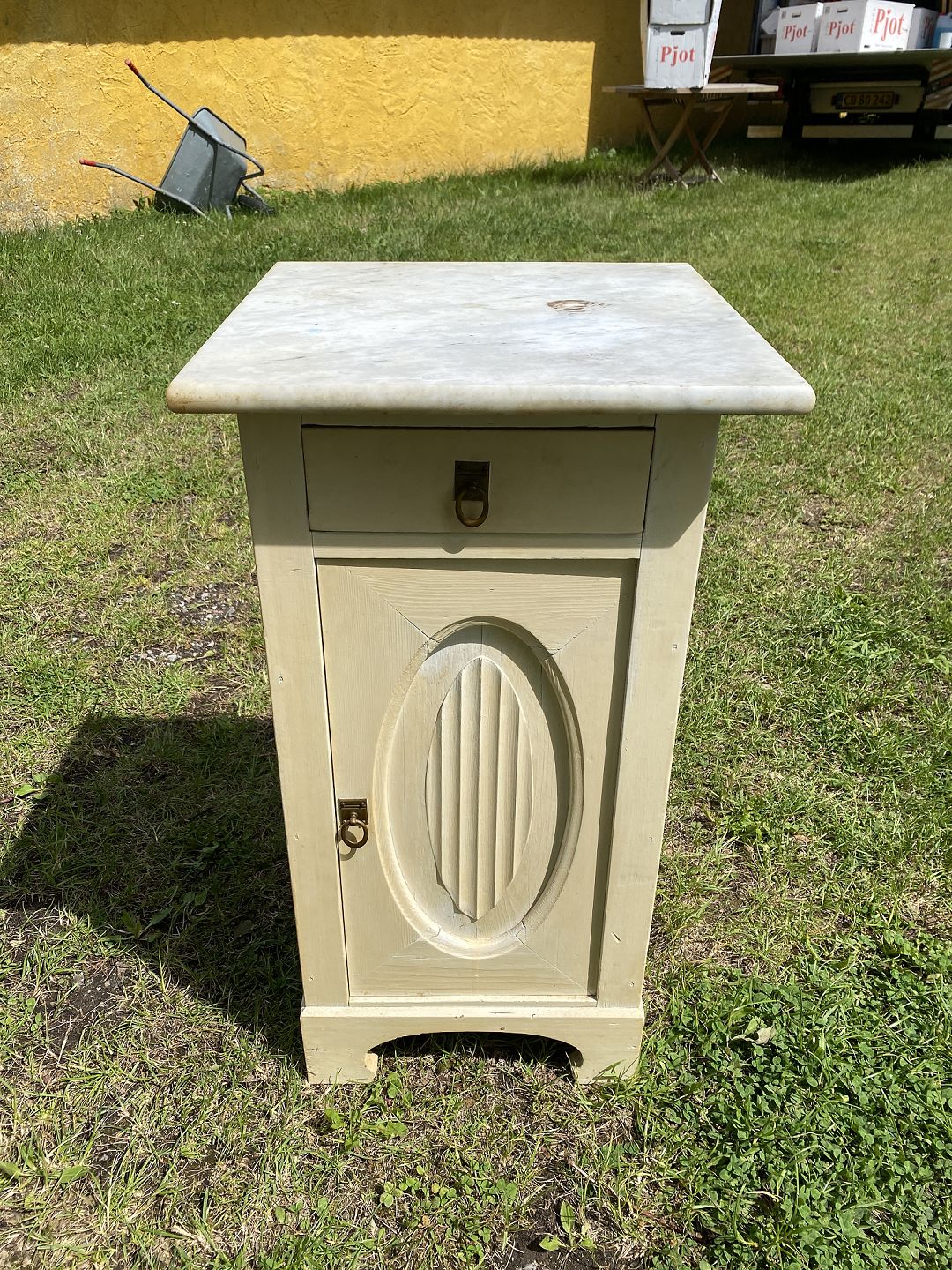 Malet savante i fyrtræ med marmorplade fra ca 1920'erne. Det har brugsspor og mangler en kile på det ene bagben. Højde 75 cm. Bredde 35 cm. Dybde 37 cm. Pladen 42x42x2cm Emne nummer: 90651
