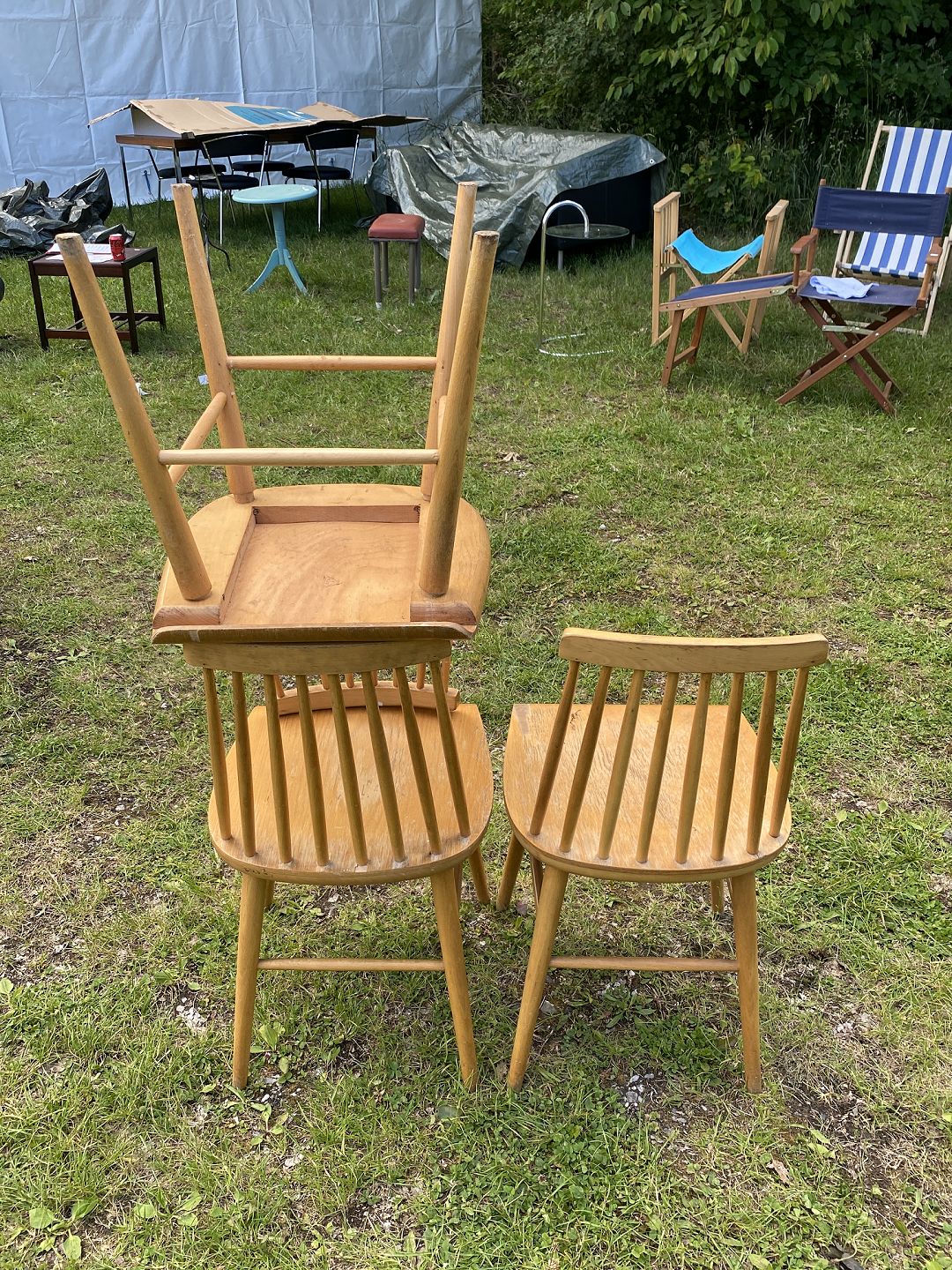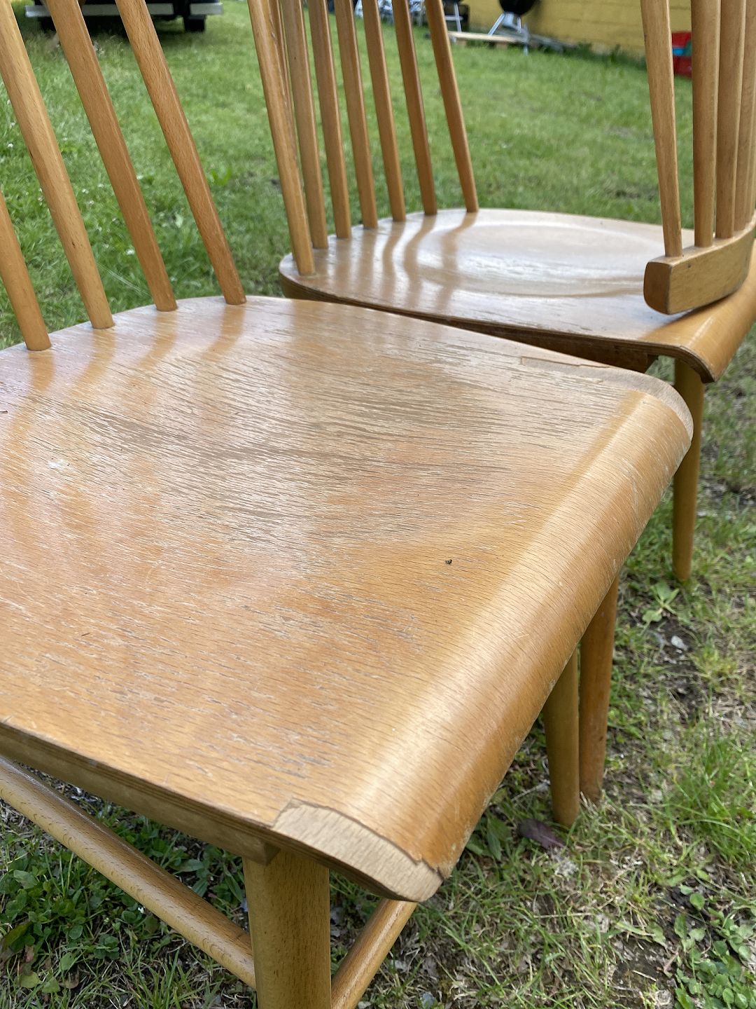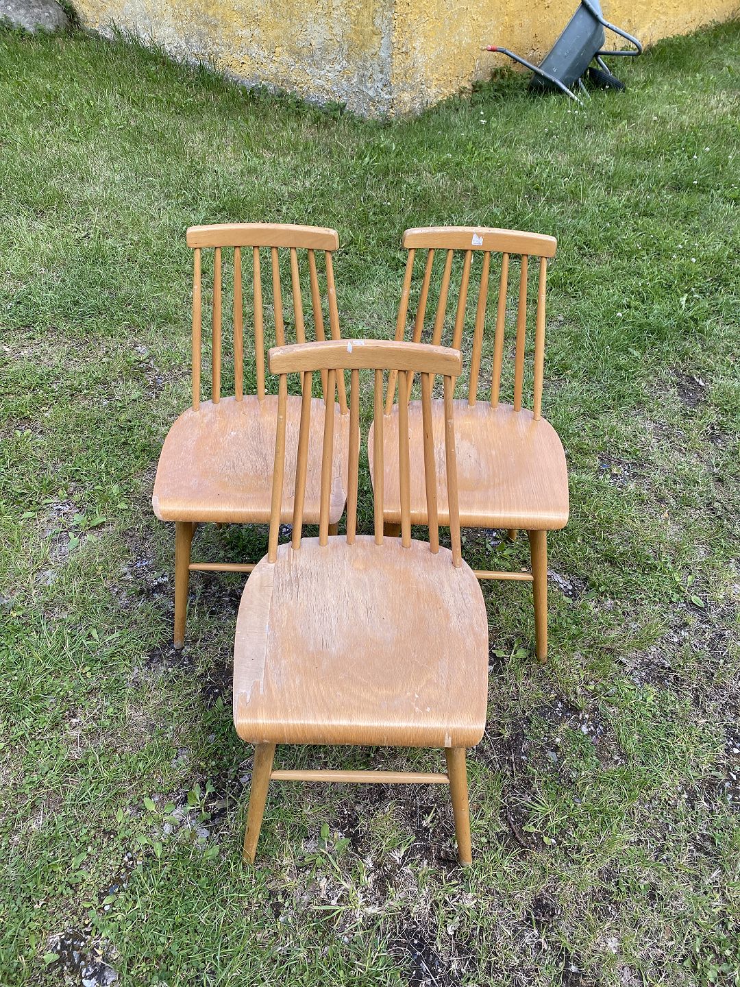 Tre pindestole i fineret Bøgetræ. Fremtår med brugsspor. Højde: 80 cm. Bredde: 41 cm. Dybde 42 cm. Sædehøjde: 45cm Emne nummer: 90657