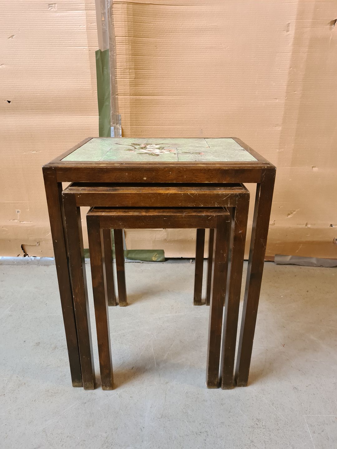 3 Indskudsborde i birketræ, fra 1930erne. De har brugsspor. Højde 56cm Bredde 44cm Dybde 56cm Emne nummer: 75569