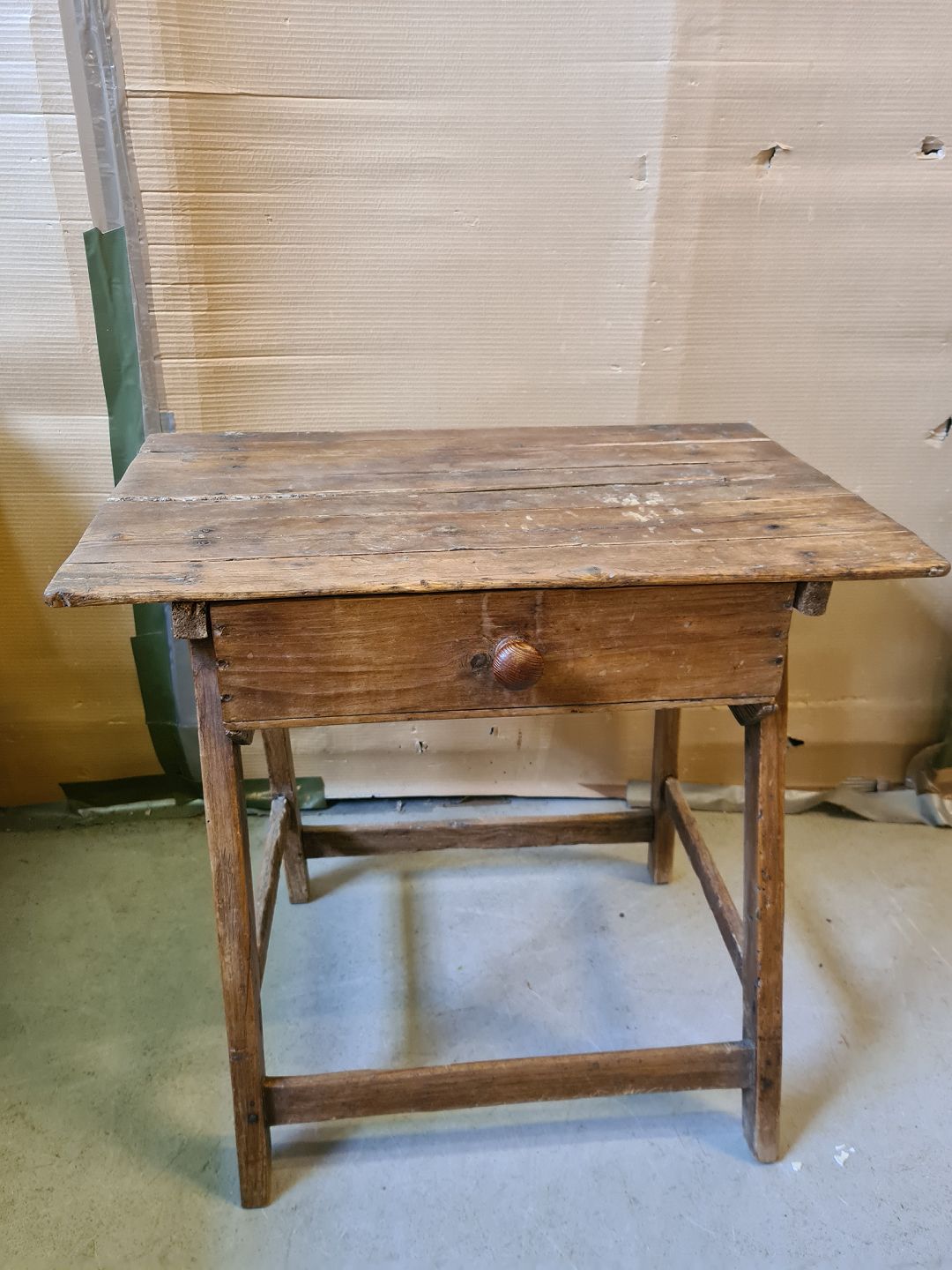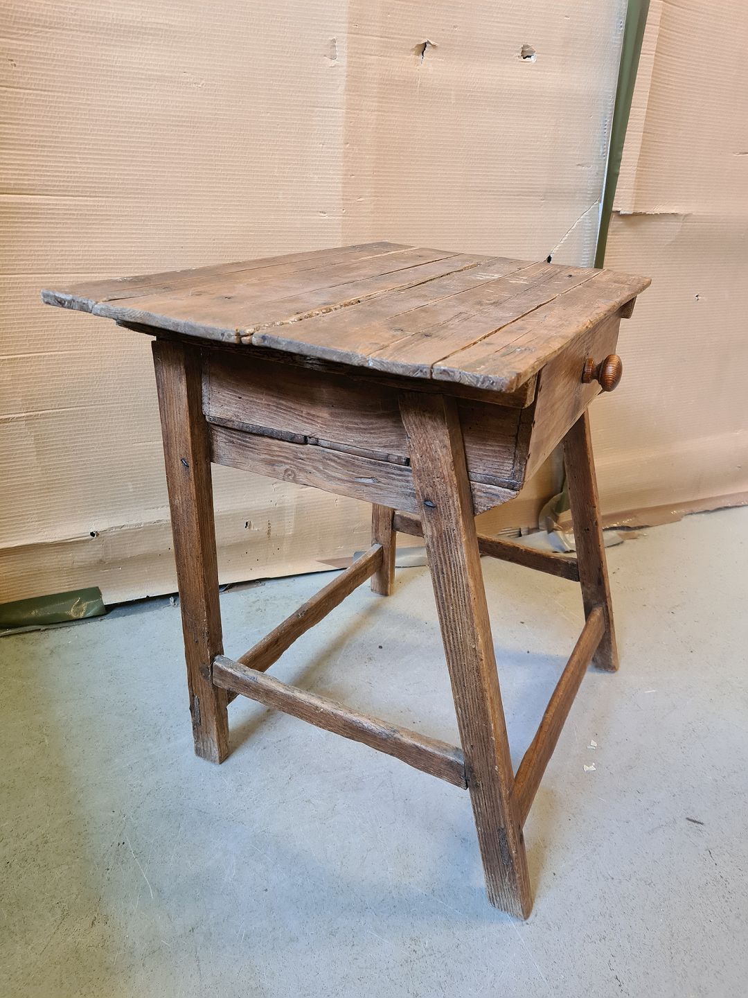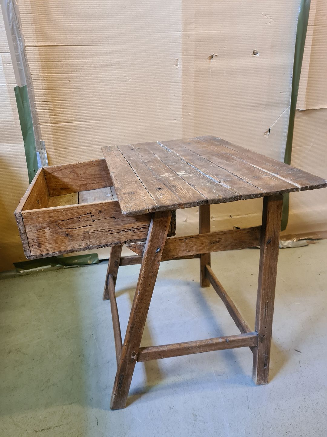 Bord med skuffe i massivt fyrretræ, fra 1880erne. Det har brugsspor. Højde 59cm Bredde 68cm Dybde 42cm Emne nummer: 75584