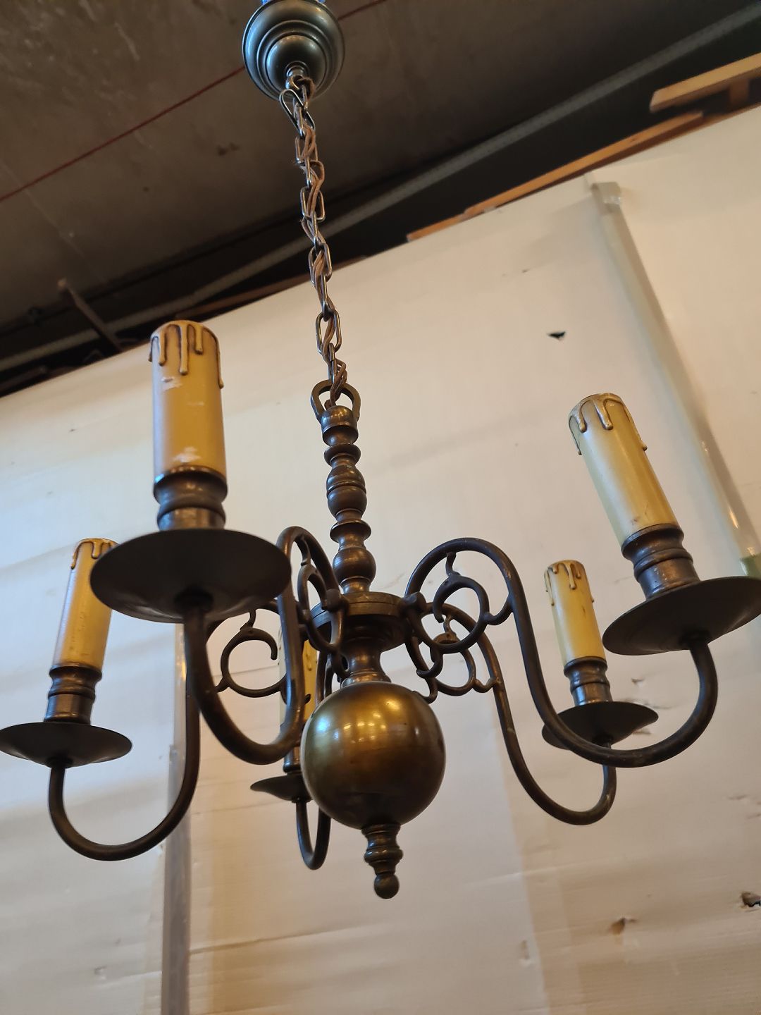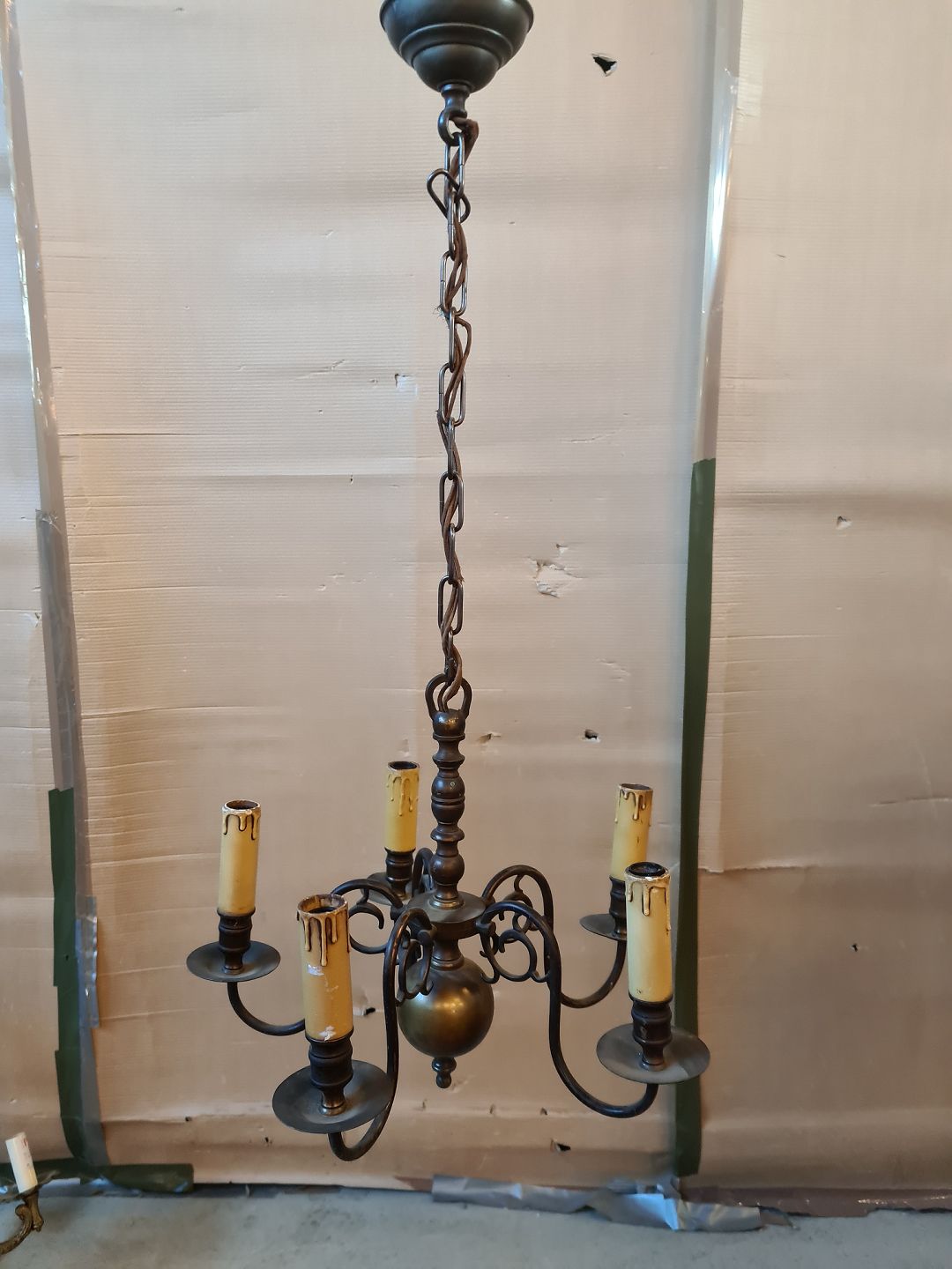 5-Armet kirkekrone i bruneret messing, fra 1930erne. Den har brugsspor og ledningen i kæden skal skiftes. Højde med kæde 80cm Diameter 42cm Emne nummer: 75610