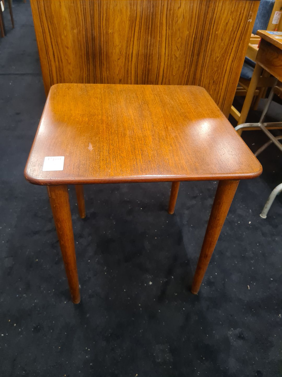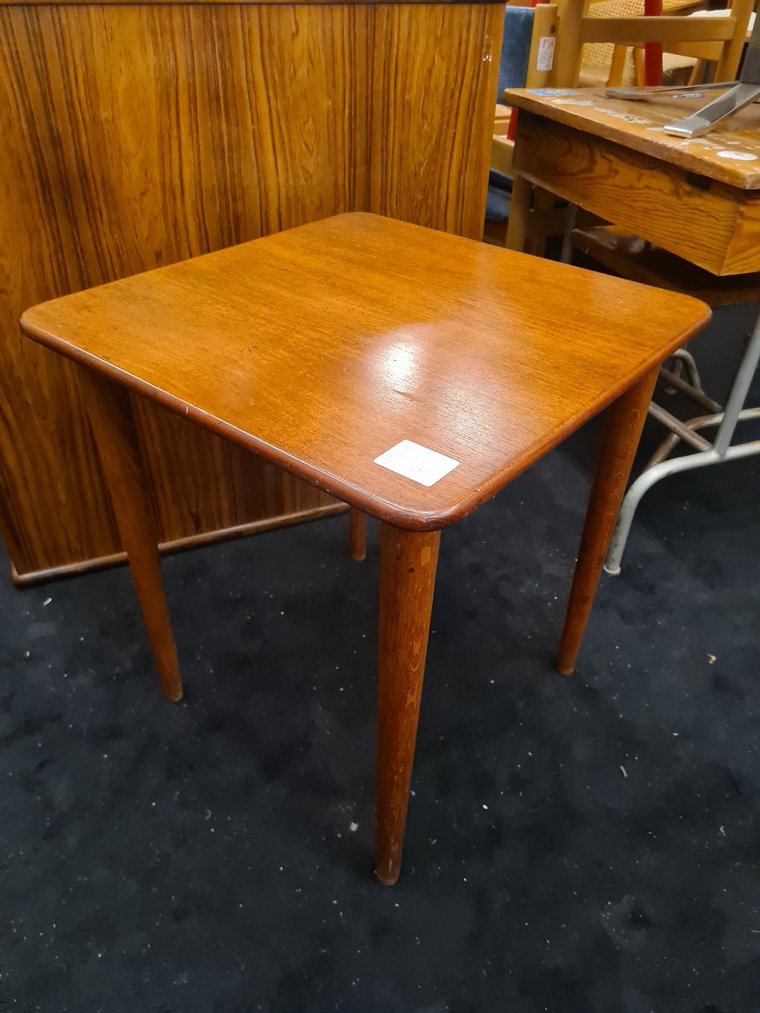 Kvadratisk lampebord fra 1960´erne med plade i teak og ben i eg. Fremstår pænt og velholdt uden nævneværdige brugsspor. Højde 55 cm. Længde 50 cm. Bredde 50 cm. Emne nummer: 80480