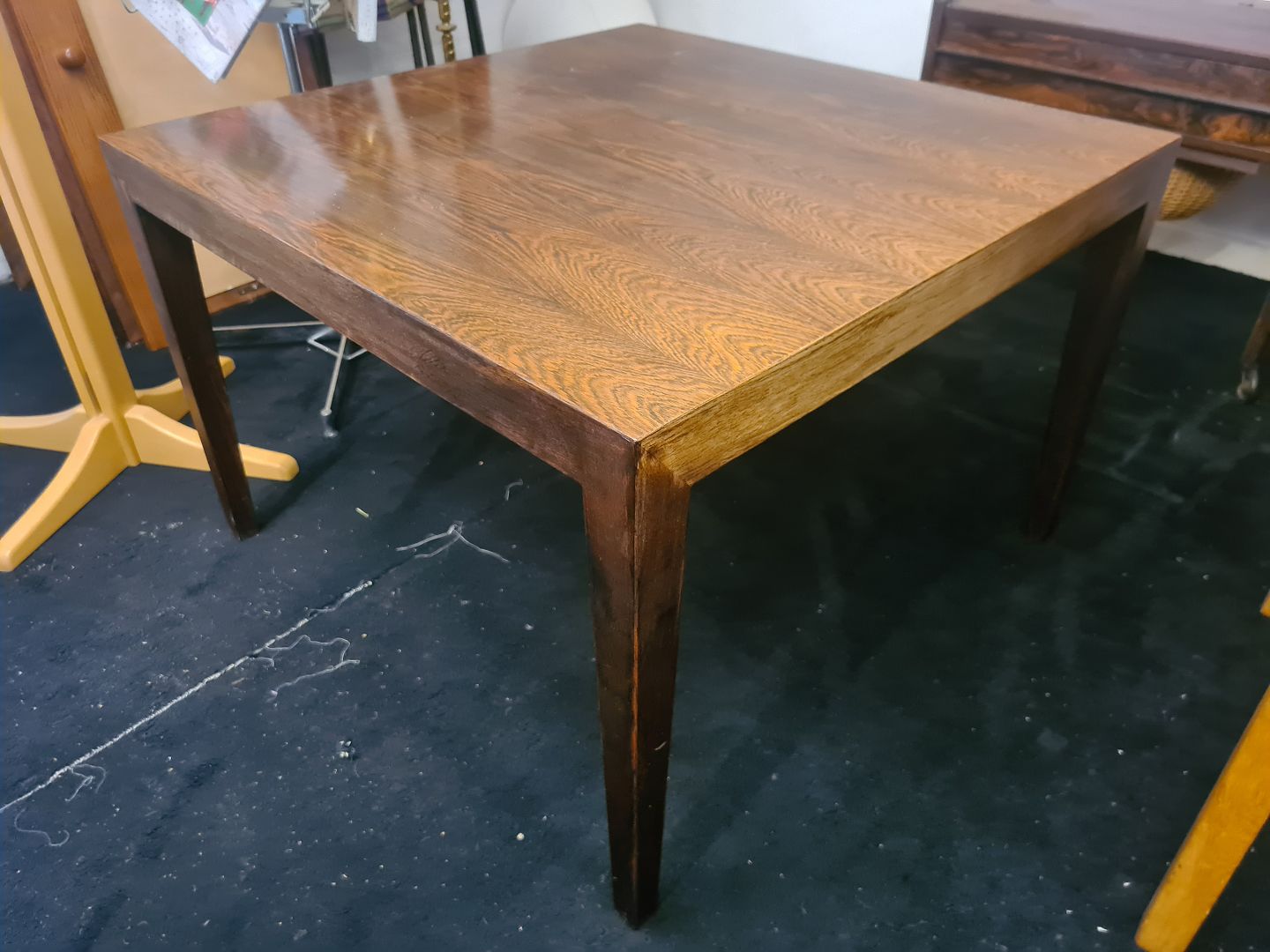 Kvadratisk Severin Hansen sofabord fra 1970´erne i finèret palisander. Fremstår pænt og velholdt uden nævneværdige brugsspor. Højde 50 cm. 74 cm. 74 cm. Emne nummer: 80483