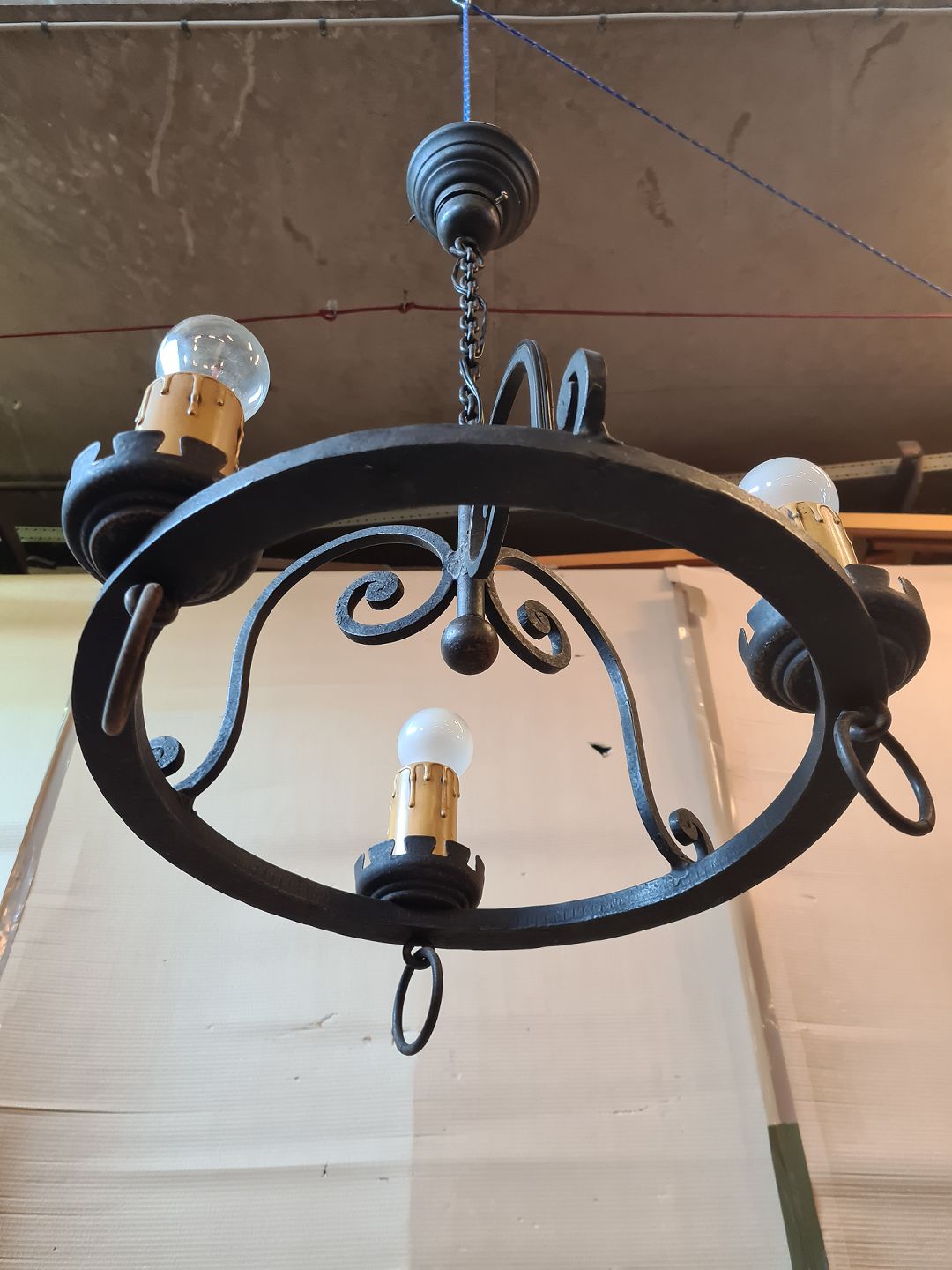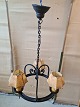 Loftlampe i smedejern, fra 1910erne. Den har brugsspor og skærmene har defekter. Højde 82cm Diameter 47cm Emne nummer: 75656