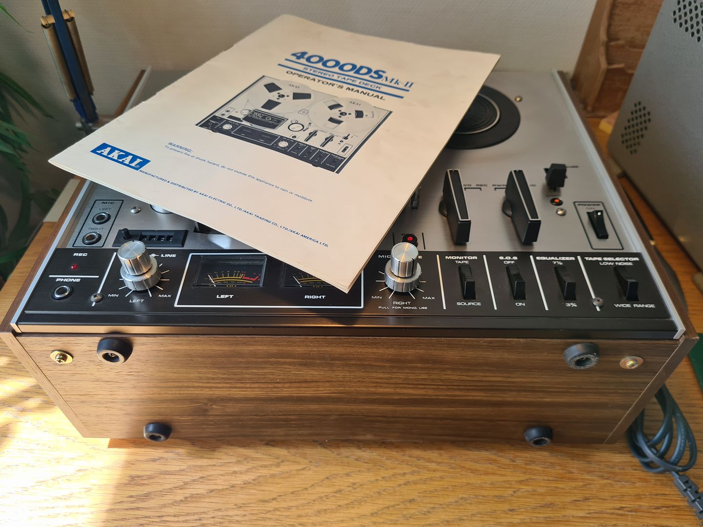 AKAI Spolebåndoptager model 4000DS MK-II. Pæn original stand og spiller helt fint. Original manual medfølger. Højde 32 cm. Bredde 40 cm. Dybde 15 cm. Emne nummer: 60602