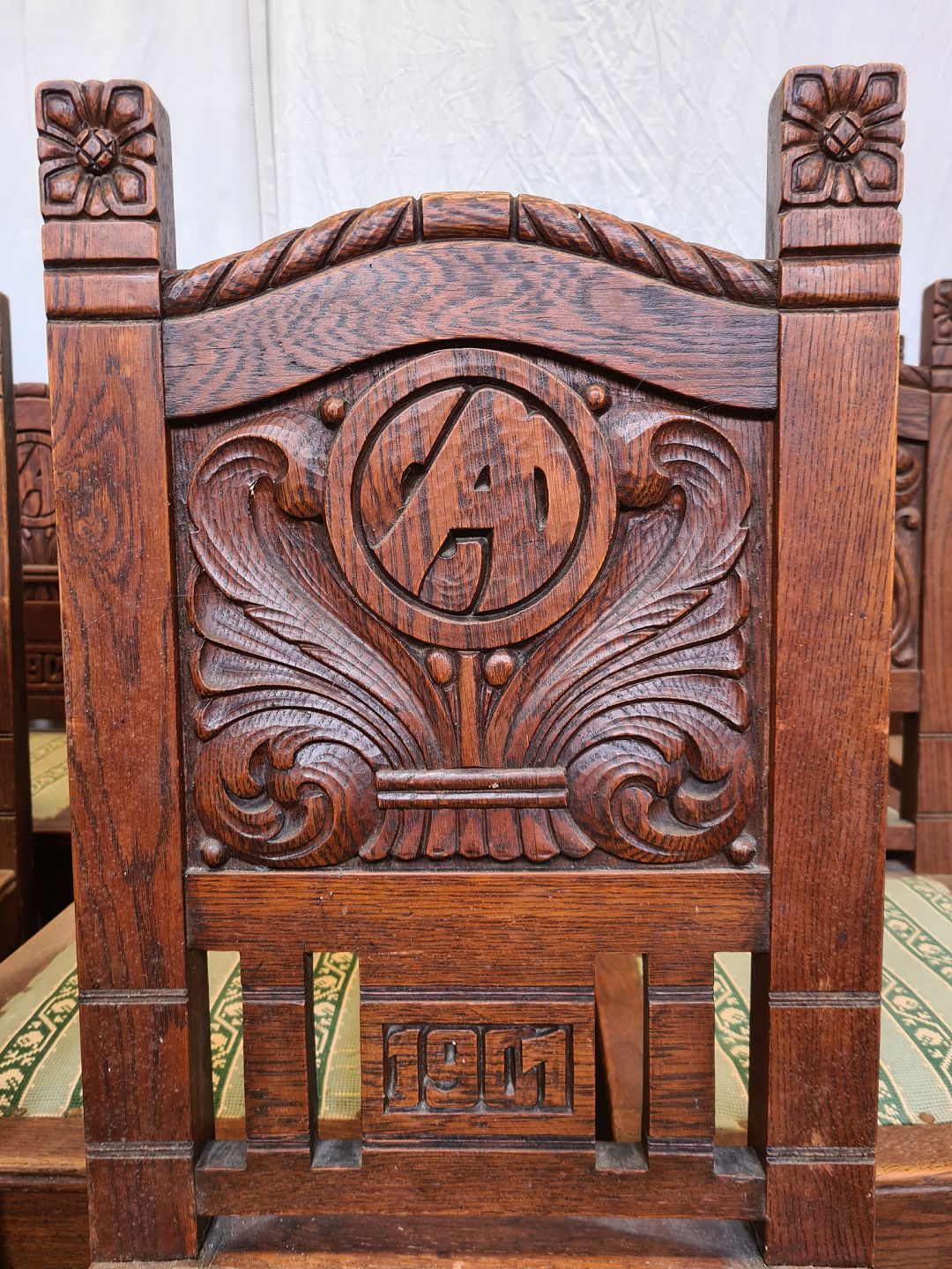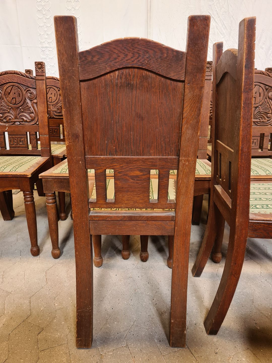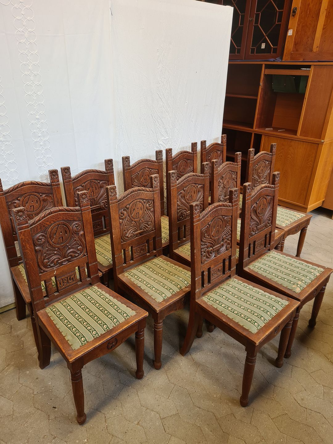 12 Robuste stole i massivt egetræ, fra 1900erne. De har brugsspor. Ryghøjde 102cm Sædehøjde 47cm Emne nummer: 90748