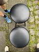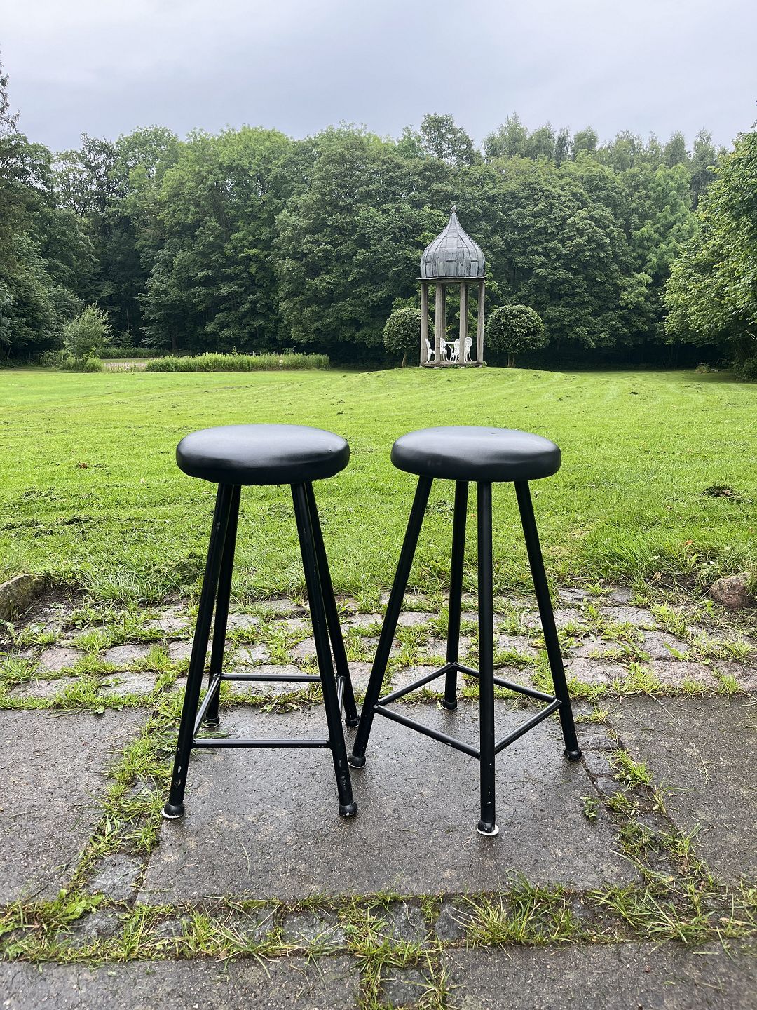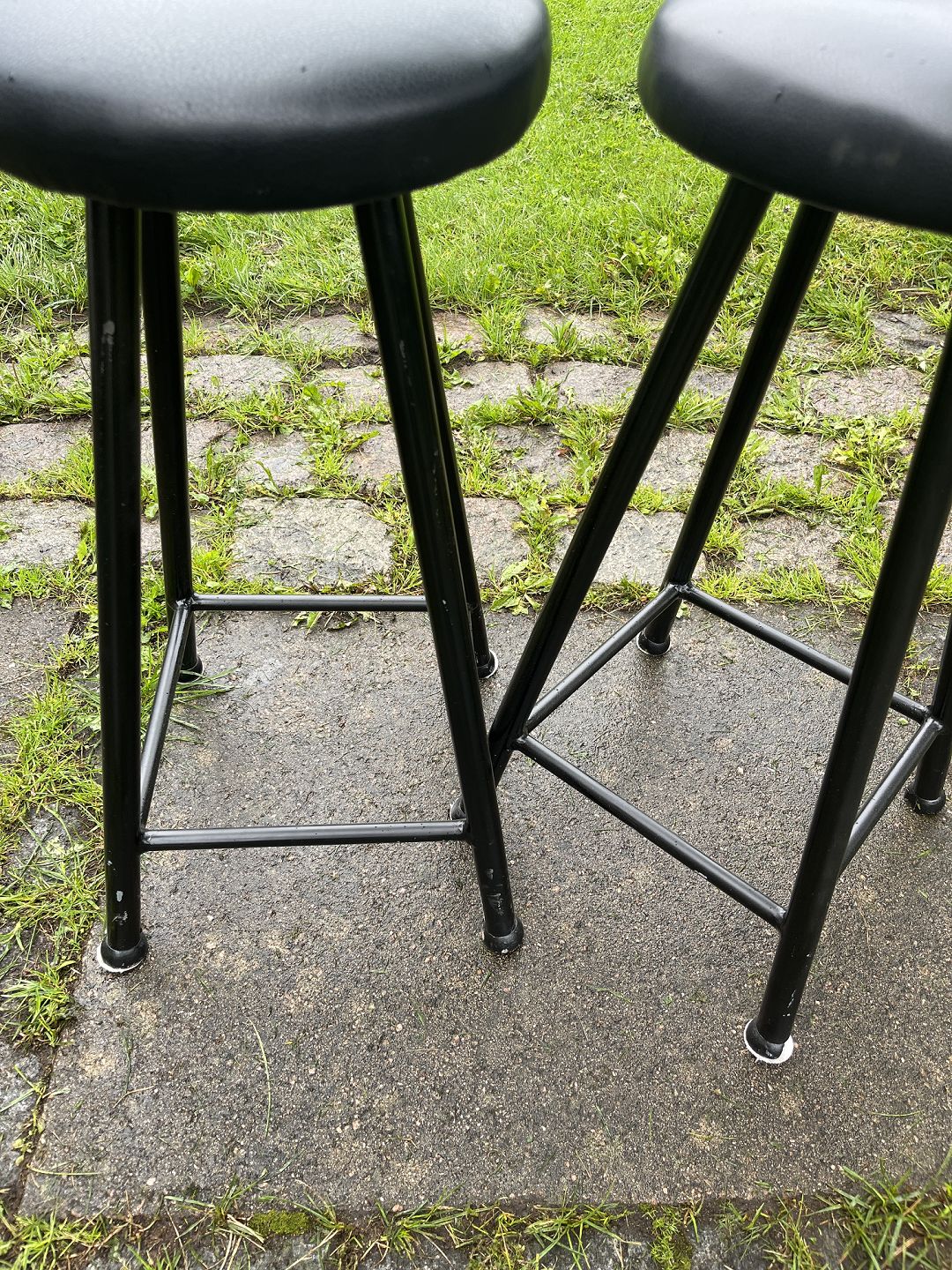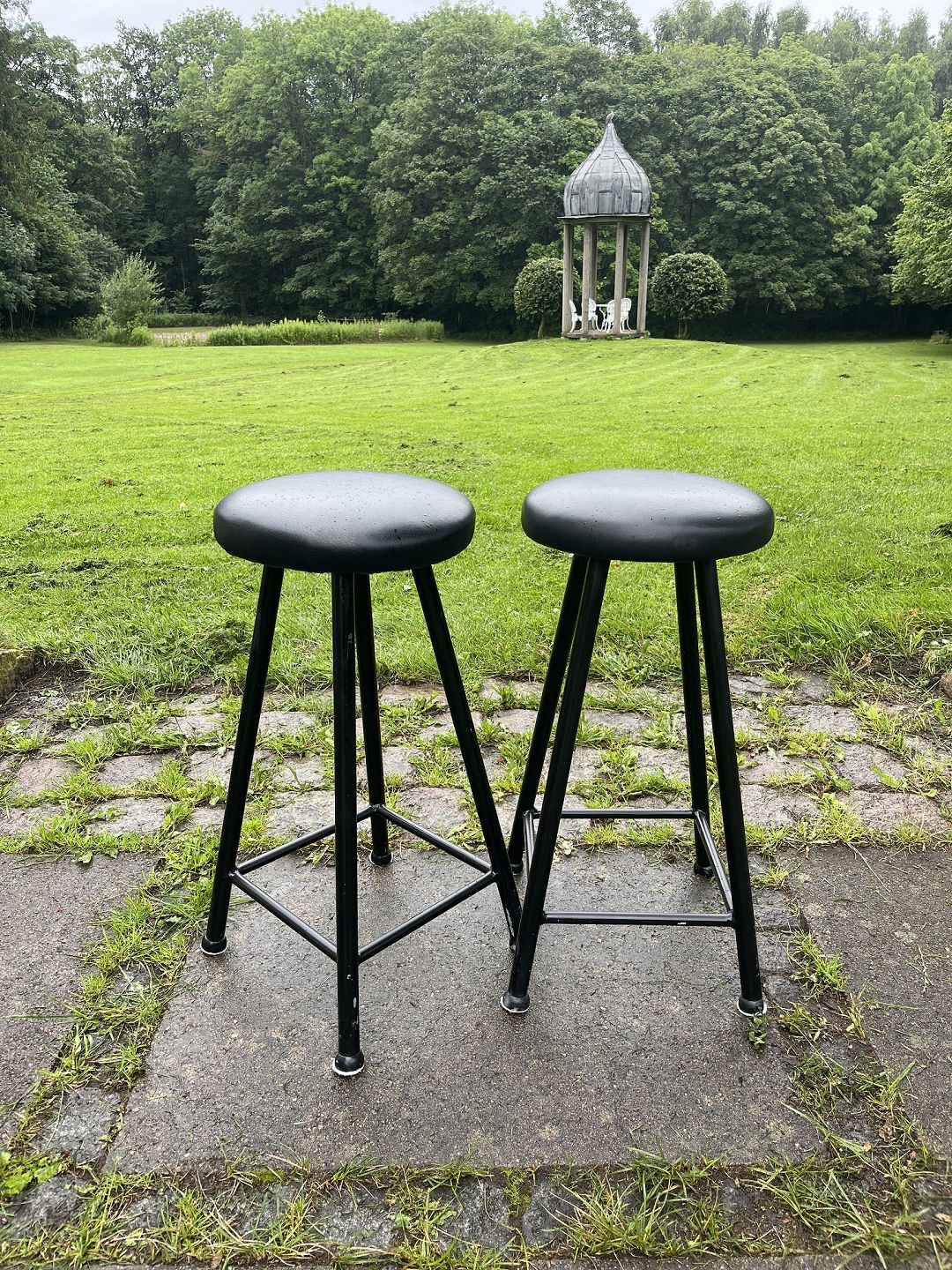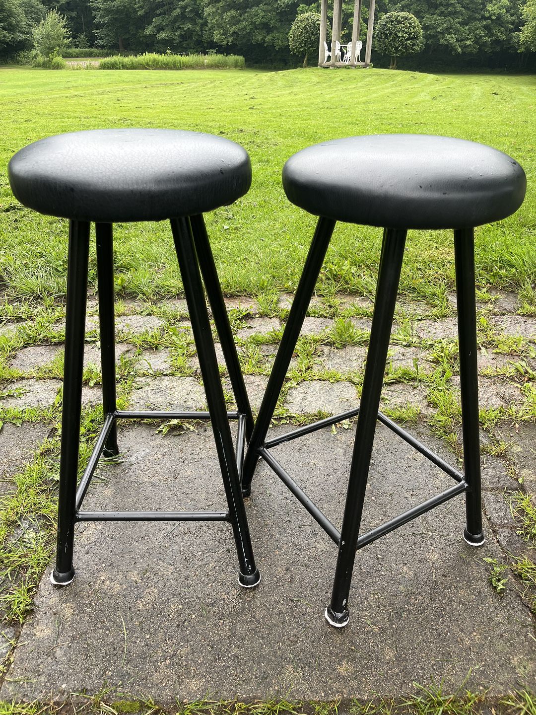 Dansk produceret par barstole m. stel af sortmalet metal samt sæde betrukket med sort læder. Produceret omkring 1980'erne. Pæn stand. Mål: H. 65 cm. Sæde Ø. 31 cm. Emne nummer: 80524