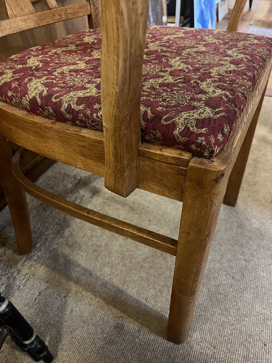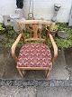 Dansk snedkermester armstol fra omkring 1930’erne i massiv egetræ og sæde i møbelstof. Den har brugsspor. Se foto for defekter Højde 81 cm. Bredde 58 cm. Dybde 54 cm. Sædehøjde 47 cm. Emne nummer: 80538