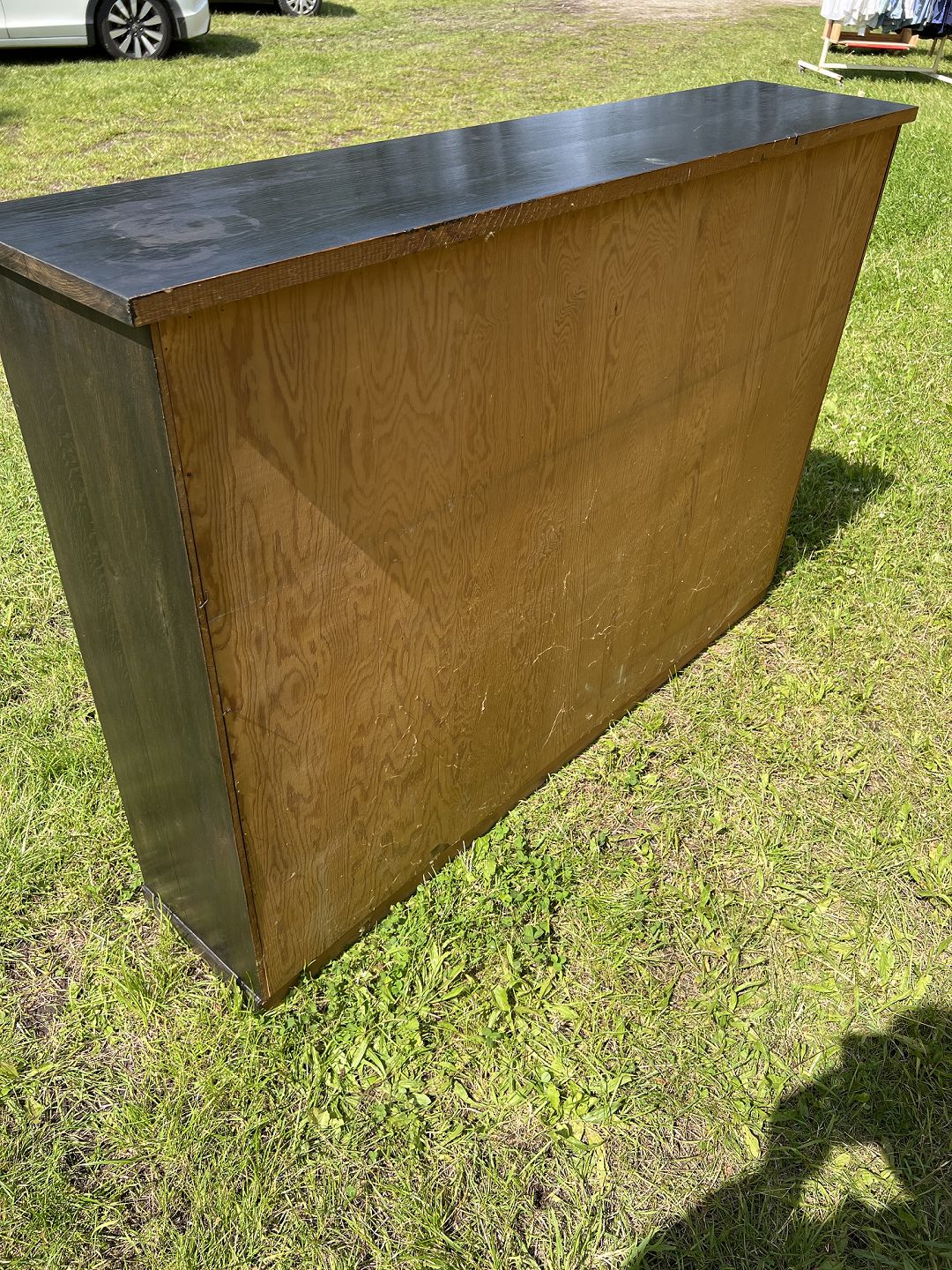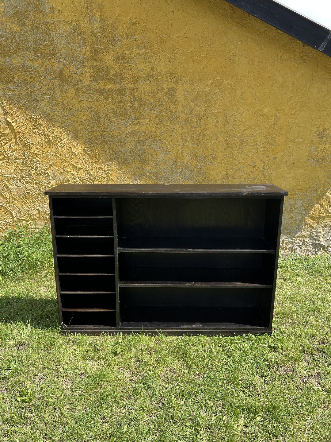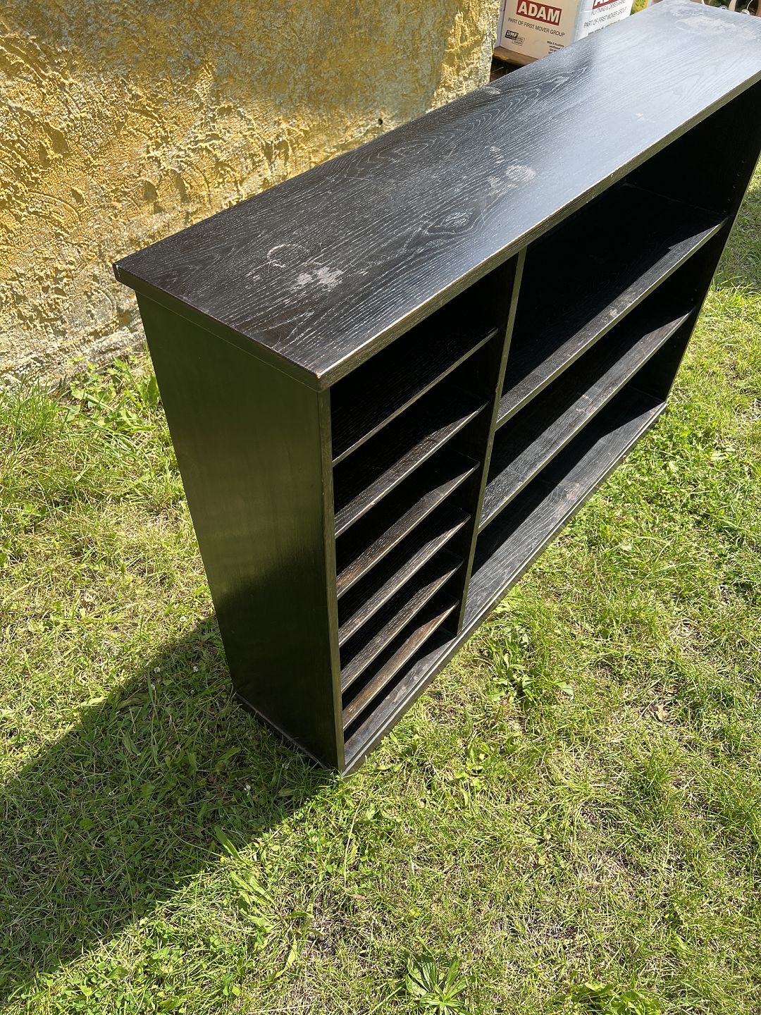 Reol udført i massiv sortlaseret egetræ med delvis justerbar hylder. Dansk produceret ca. 1930. Brugt stand stand med skjolder på toppen samt en arkivhylde m. skade. Mål: H. 106 cm. B. 155 cm. D. 33 cm. Emne nummer: 80540