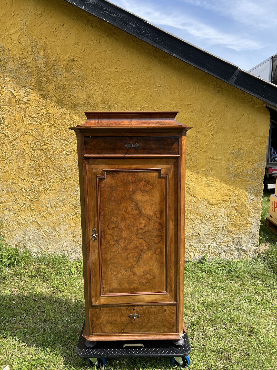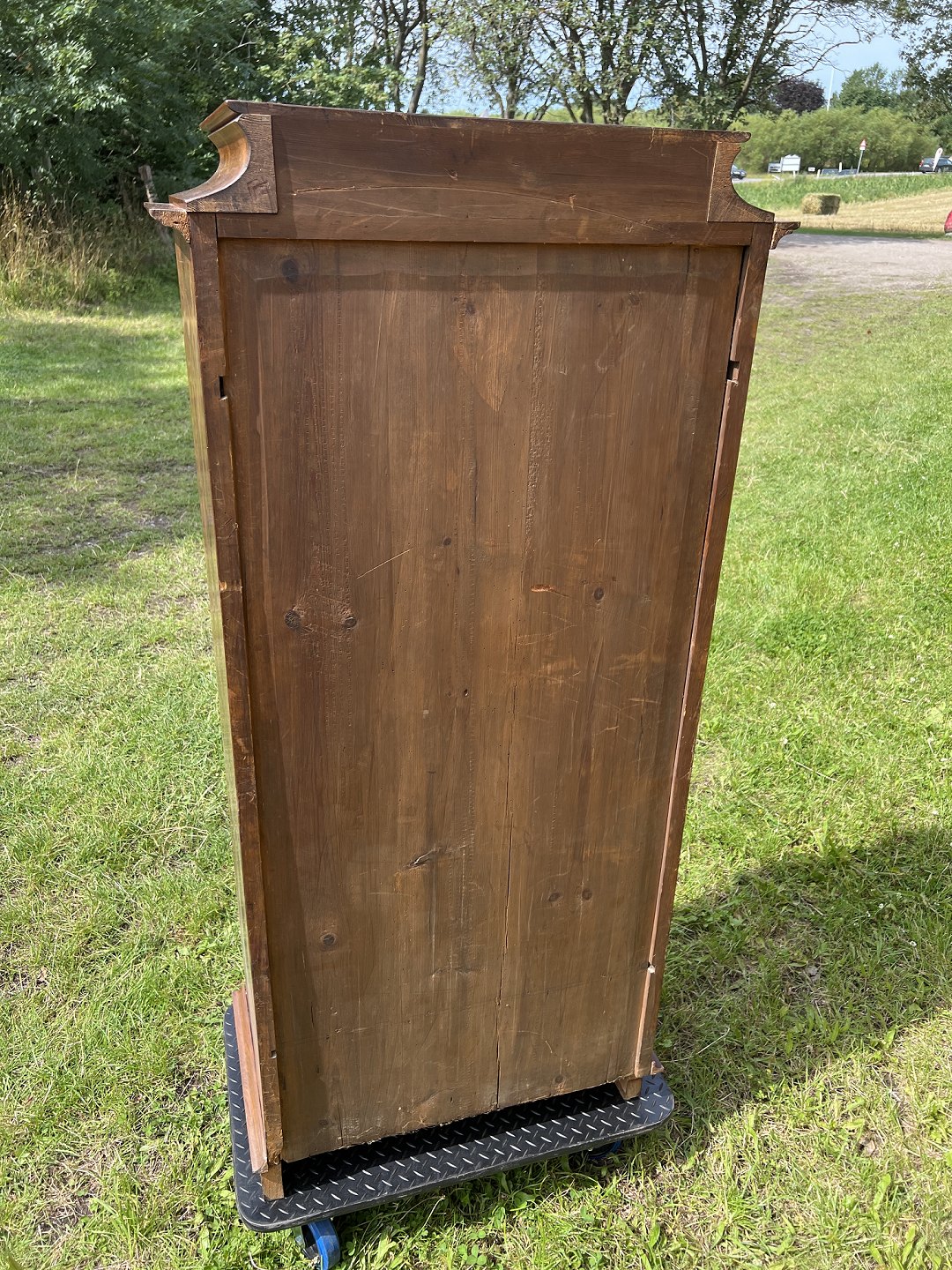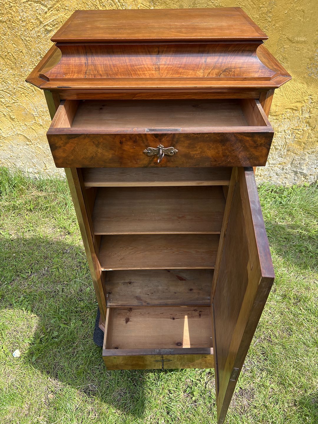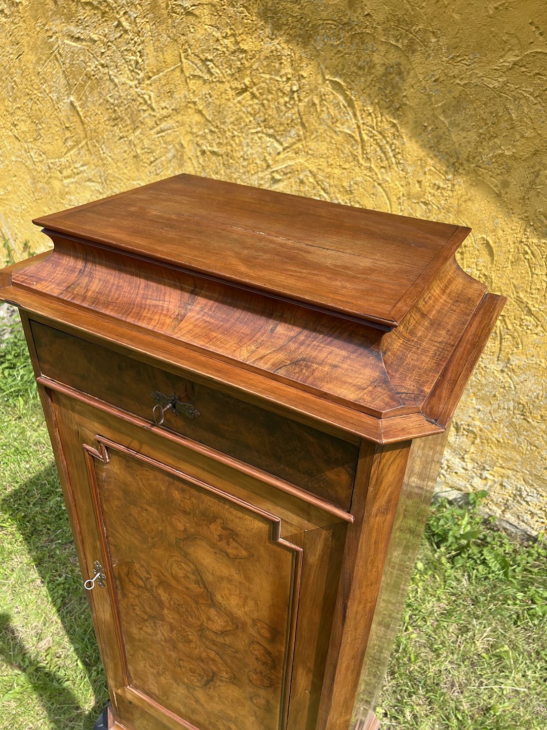 Empire piedestsalskab fineret nøddetræ udført ca. 1880-90. Pæn brugt stand, fremstår med brugsspor samt løse lister. Mål: H. 156 cm. B. 73 cm. D. 45 cm. Emne nummer: 80541