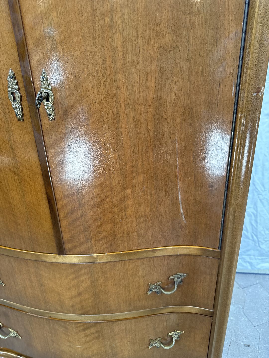 Dækketøjsskab i fineret nøddetræ, fra 1950'erne. Det har brugsspor. Højde 128 cm. Bredde 75 cm. Dybde 48 cm. Emne nummer: 90777