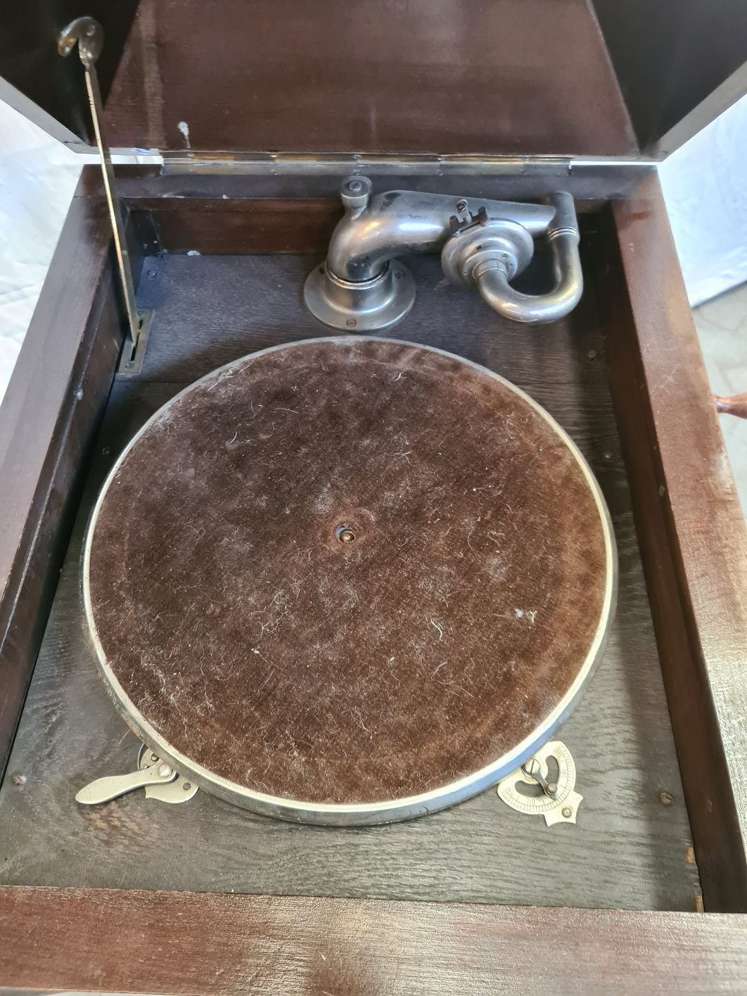 Grammafonskab i fineret egetræ, fra 1920erne. Det har brugsspor og gramafonen virker ikke. Højde 102cm Bredde 43cm Dybde 53cm Emne nummer: 90824