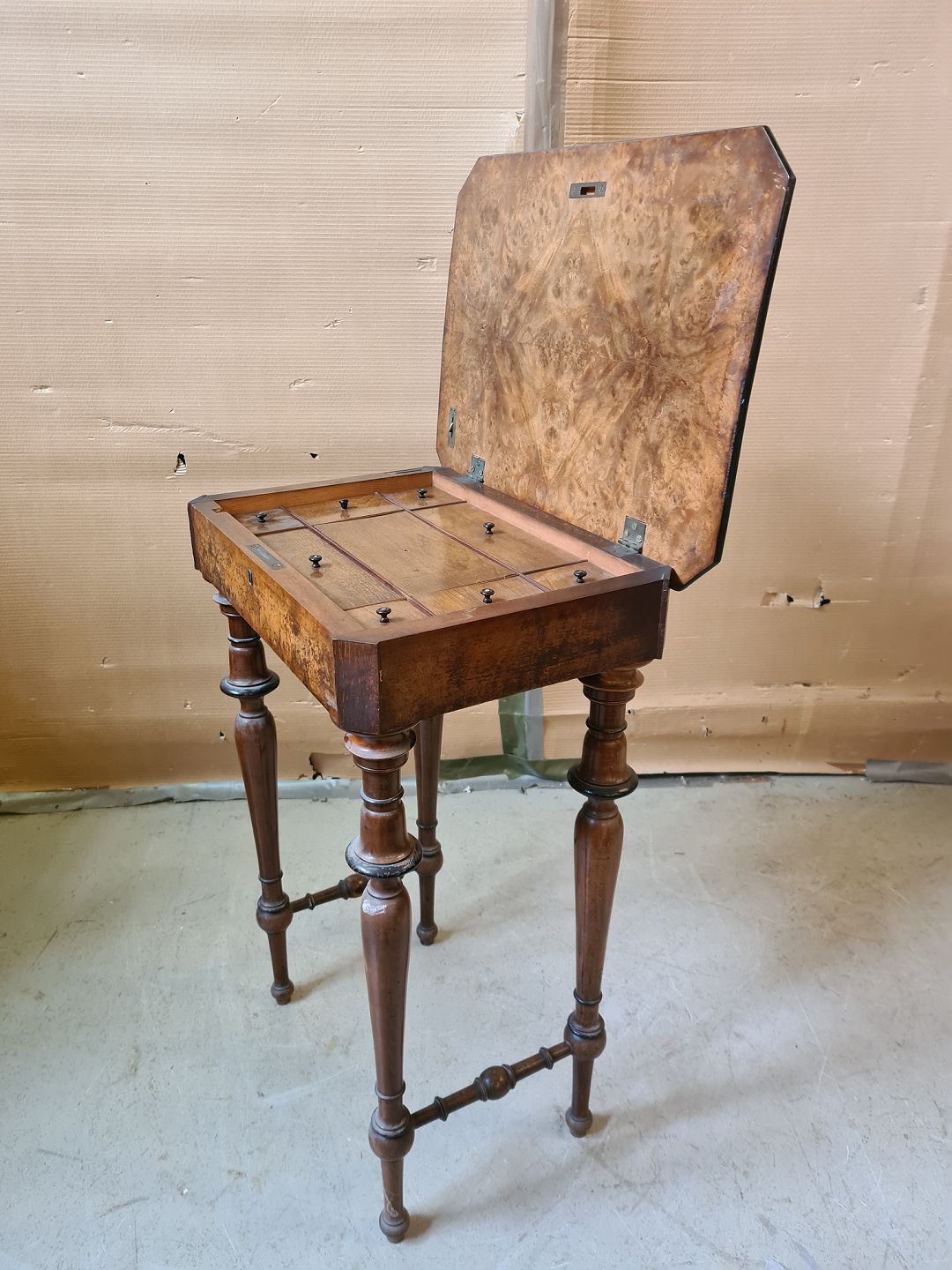 Sybord i fineret og massivt mahogni og bøgetræ, fra 1910erne. Det har brugsspor. Højde 72cm Bredde 51cm Dybde 37cm Emne nummer: 75785