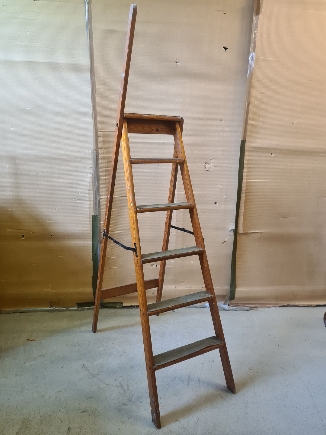 Stige i massivt fyrretræ, fra 1930erne. Den har brugsspor. Højde 194cm Øverste trin højde 149cm Emne nummer: 75814