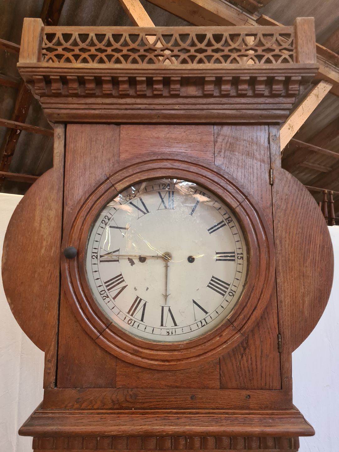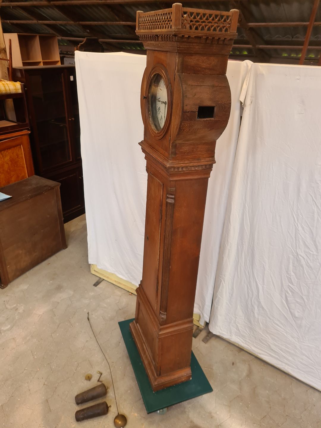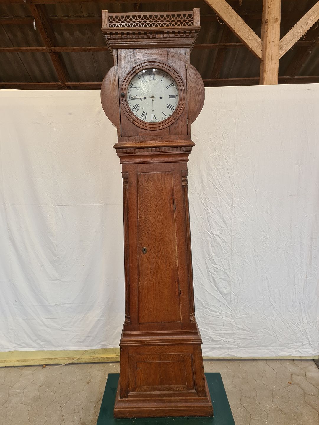 Standur i massivt egetræ, fra 1890erne. Det har brugsspor og vi har ikke tested om det virker. Højde 212cm Bredde 56cm Dybde 26cm Emne nummer: 90865