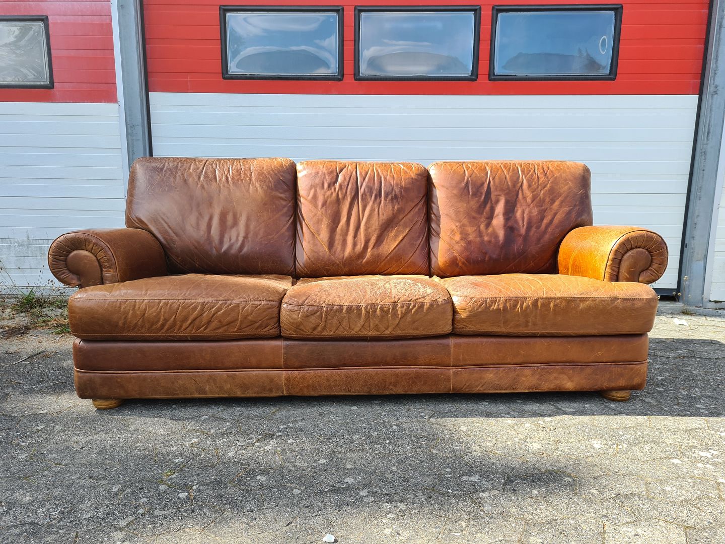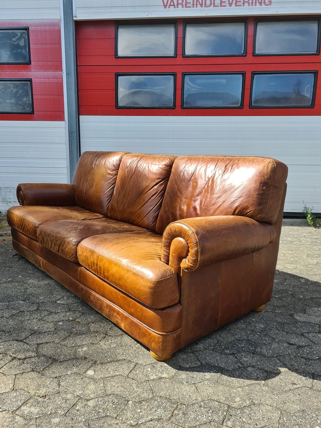 3 Personers lædersofa fra 2000erne. Den har brugsspor og slid på sædet. Ryghøjde 90cm Bredde 230cm Dybde 96cm Sædehøjde 44cm Emne nummer: 75851