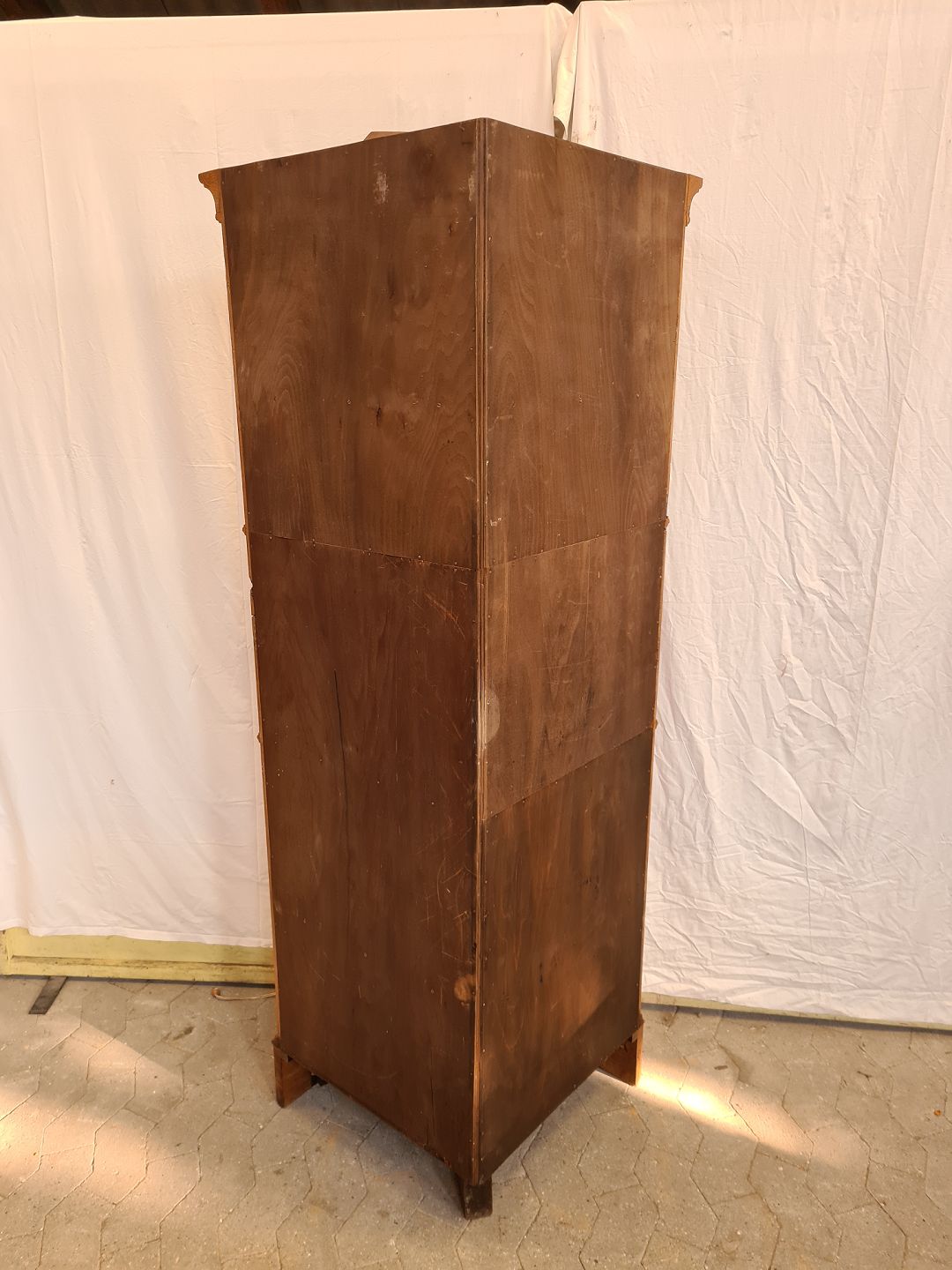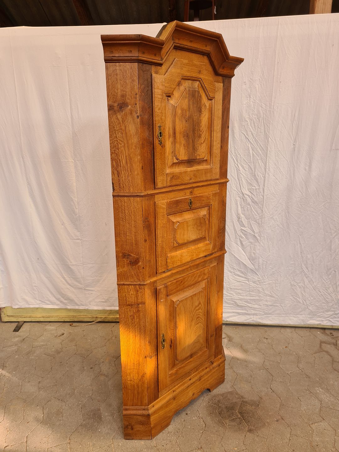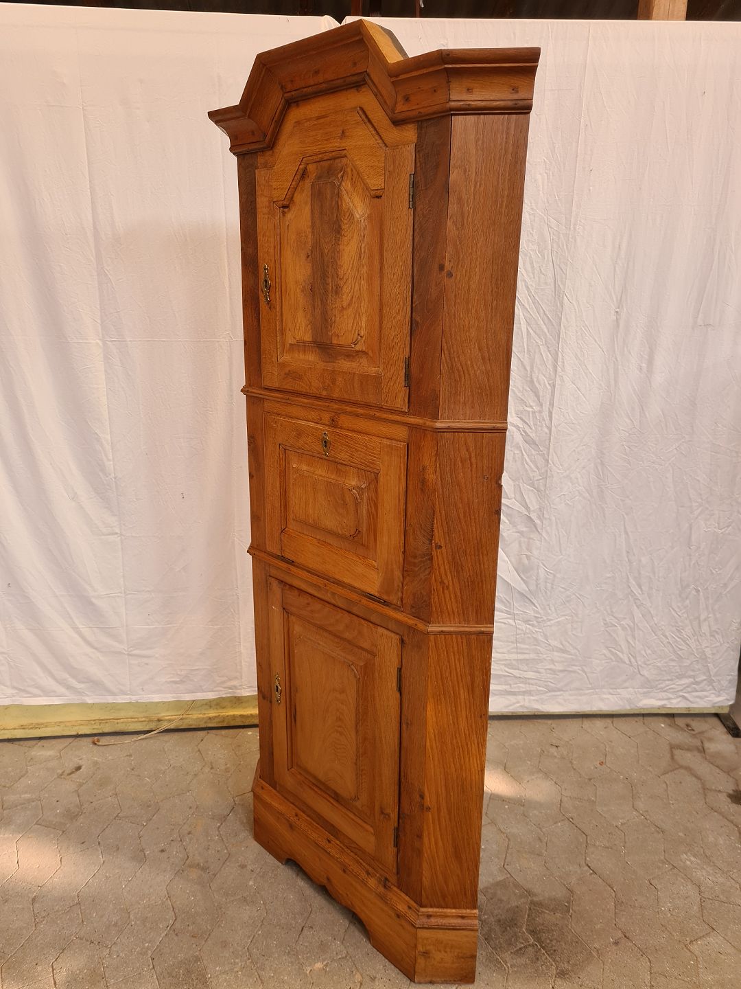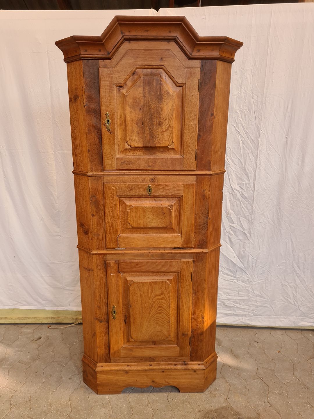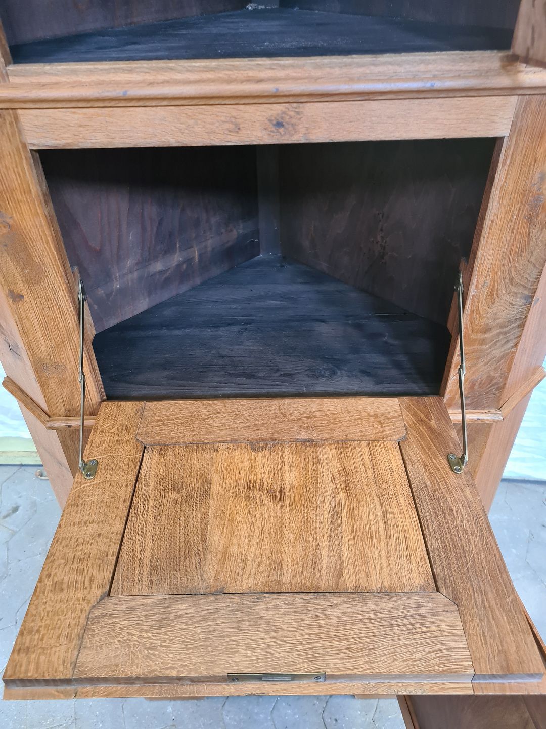 Hjørneskab i fineret egetræ, fra 1930erne. Det har brugsspor. Højde 181cm Bredde 80cm Dybder 56cm Emne nummer: 90885