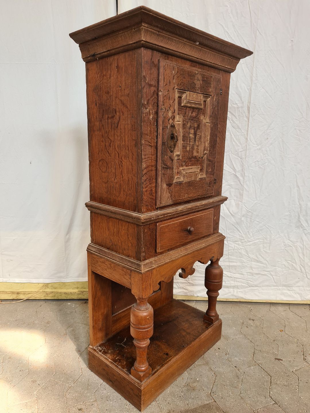 Skab i massivt egtræ, fra 1880erne. Det har brugsspor. Højde 122cm Bredde 58cm Dybde 32cm Emne nummer: 90898