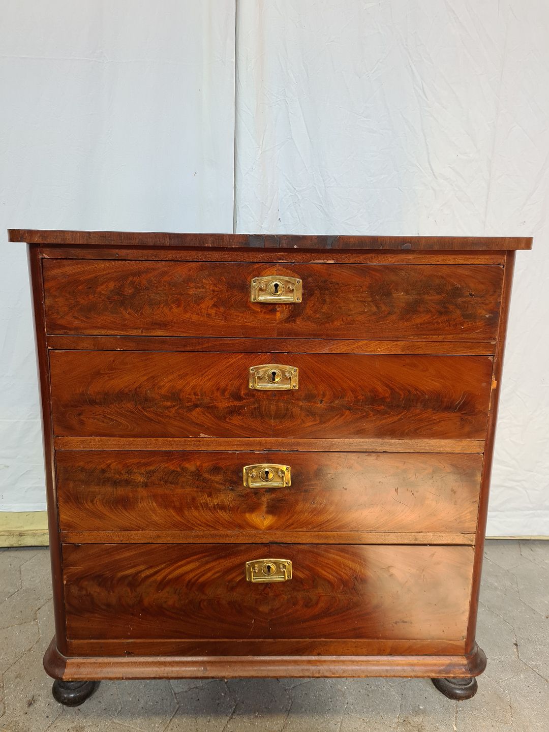 Kommode i fineret mahogni, fra 1910erne. Den har brugsspor og defekt finer. Højde 85cm Bredde 82cm Dybde 42cm Emne nummer: 90915