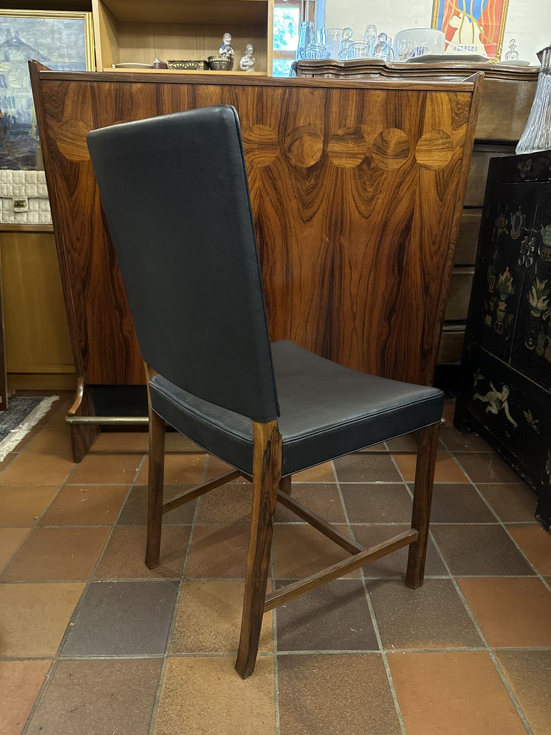 Ole Wanscher spisebordsstol udført i Palisander samt senere ombetrukket med sort læder. Udført hos snedkermester A.J. Iversen ca. 1960’erne. Pæn stand. Mål: H. 91 cm. B. 49 cm. D. 48 cm. SH. 44 cm. Emne nummer: 80557