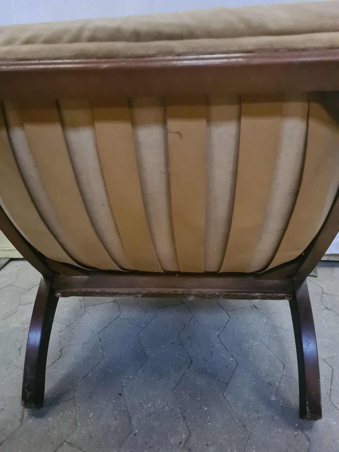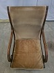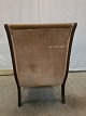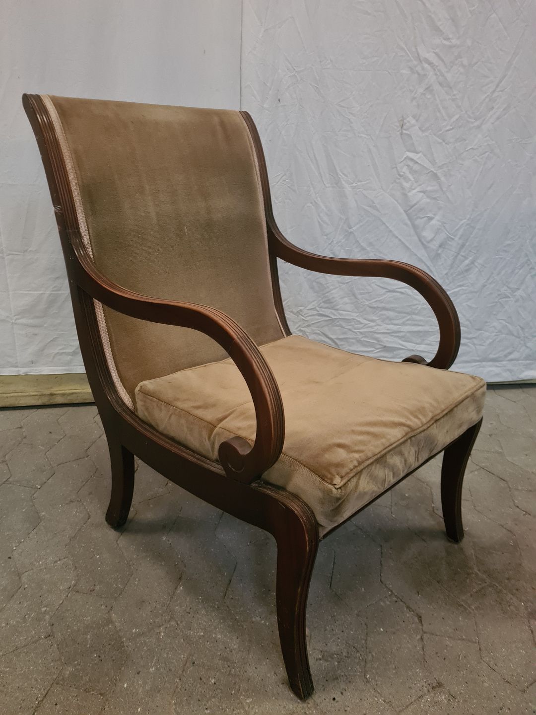 Lænestol i mahogni med velourbetræk, fra 1980erne. Gjordene er lidt slappe og den har brugsspor. Ryghøjde 86cm Sædehøjde 39cm Emne nummer: 90921