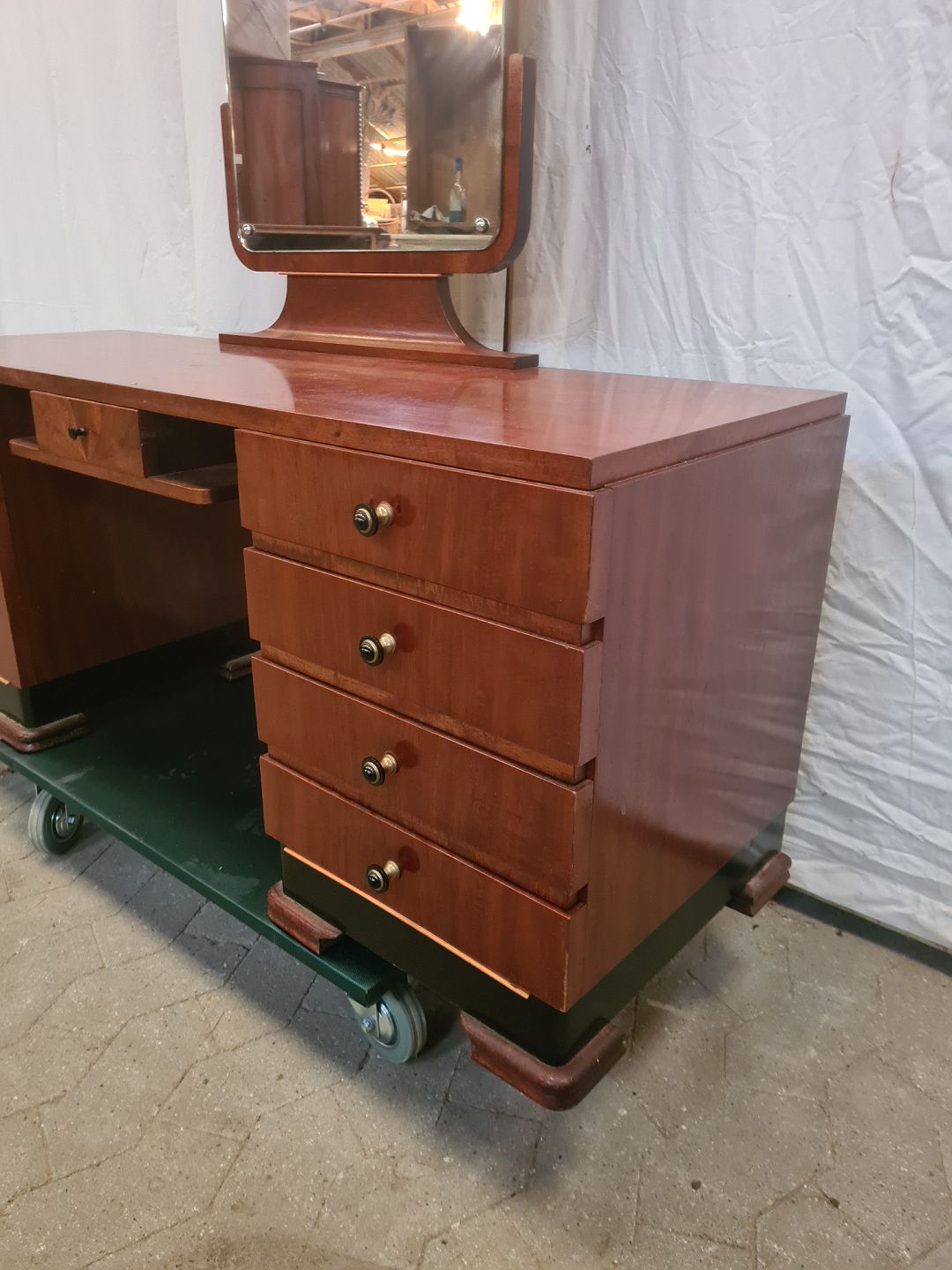 Sminkebord i fineret mahogni, fra 1930erne. Det har brugsspor og en løs liste. Højde 158cm Bredde 128cm Dybde 42cm Bordplade højde 52cm Emne nummer: 90936