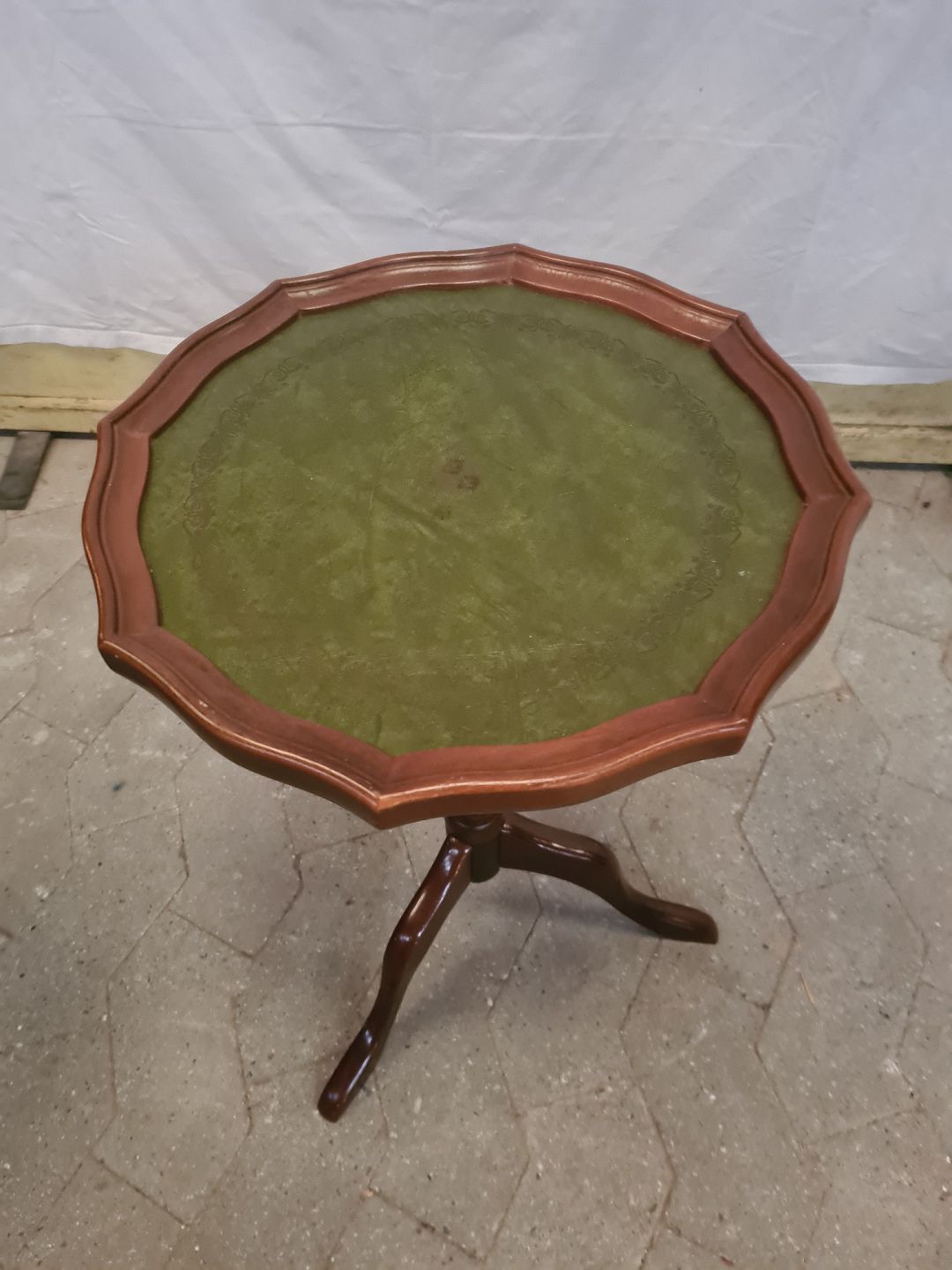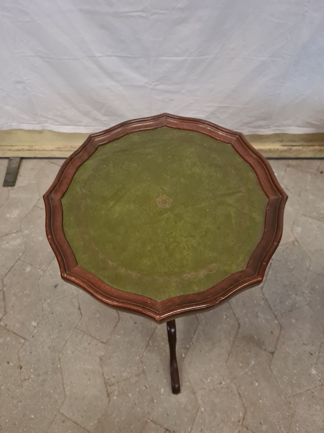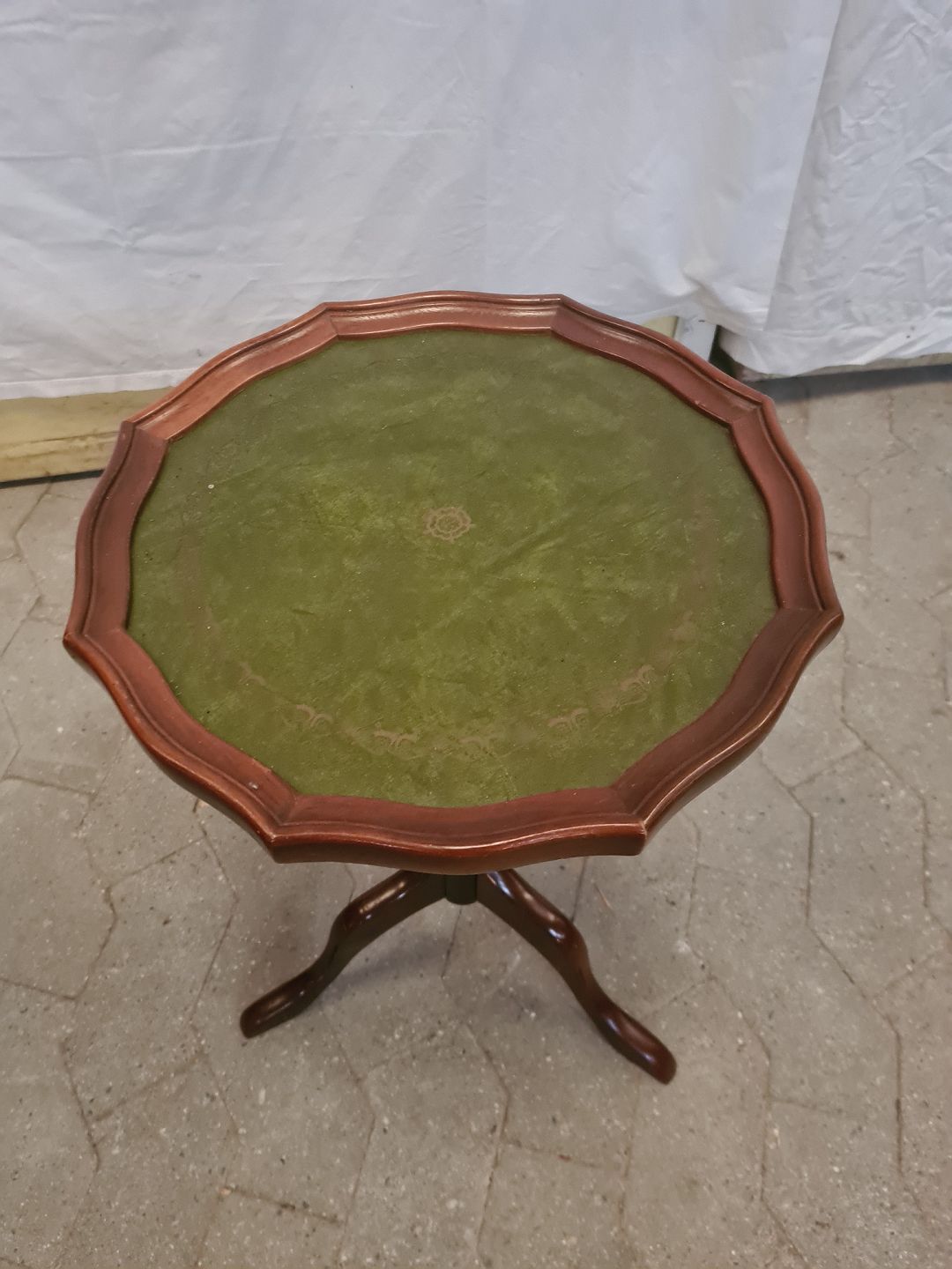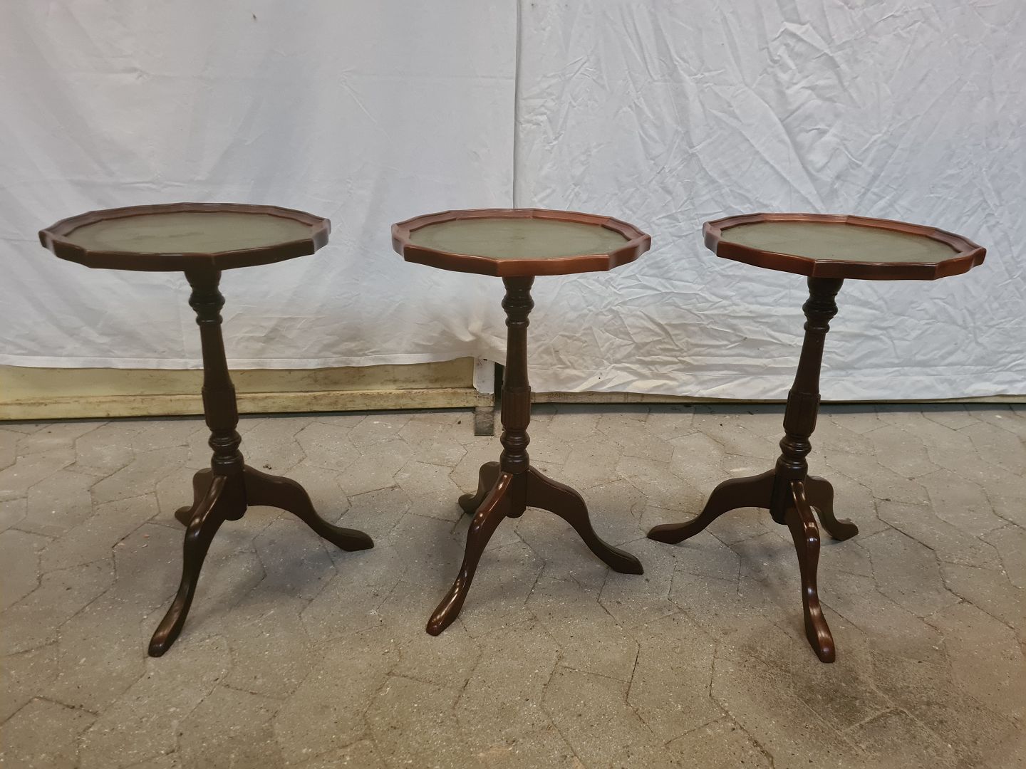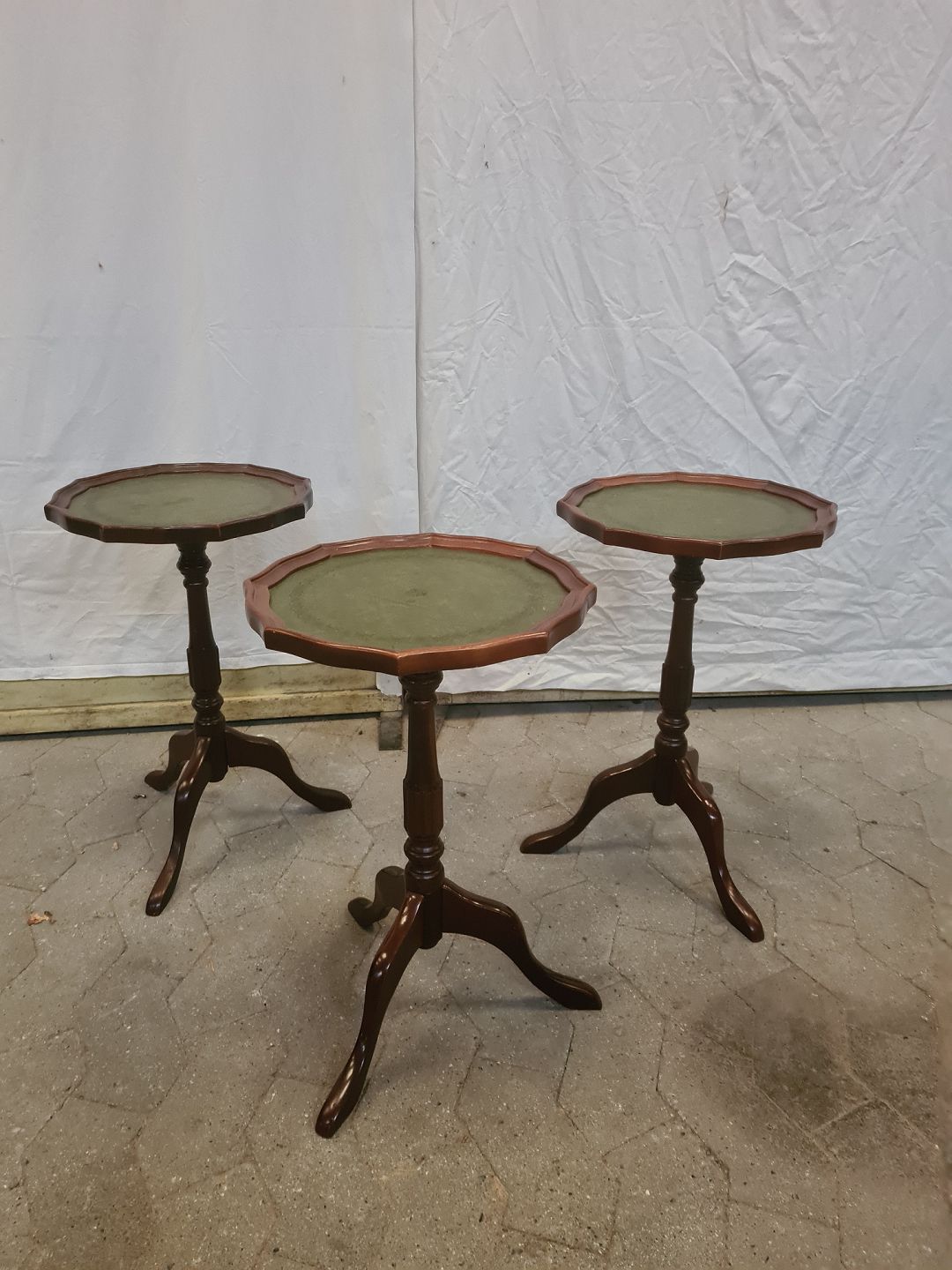 3 Små borde i bøgetræ med kunstlæder indlæg, fra 1990erne. De har brugsspor. Højde 52cm Diameter 33cm Emne nummer: 90938