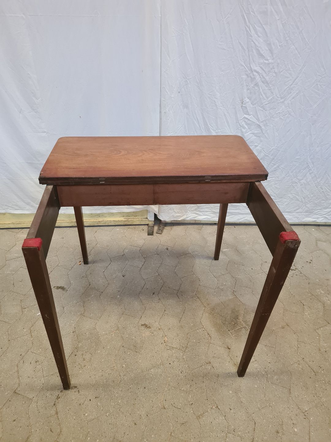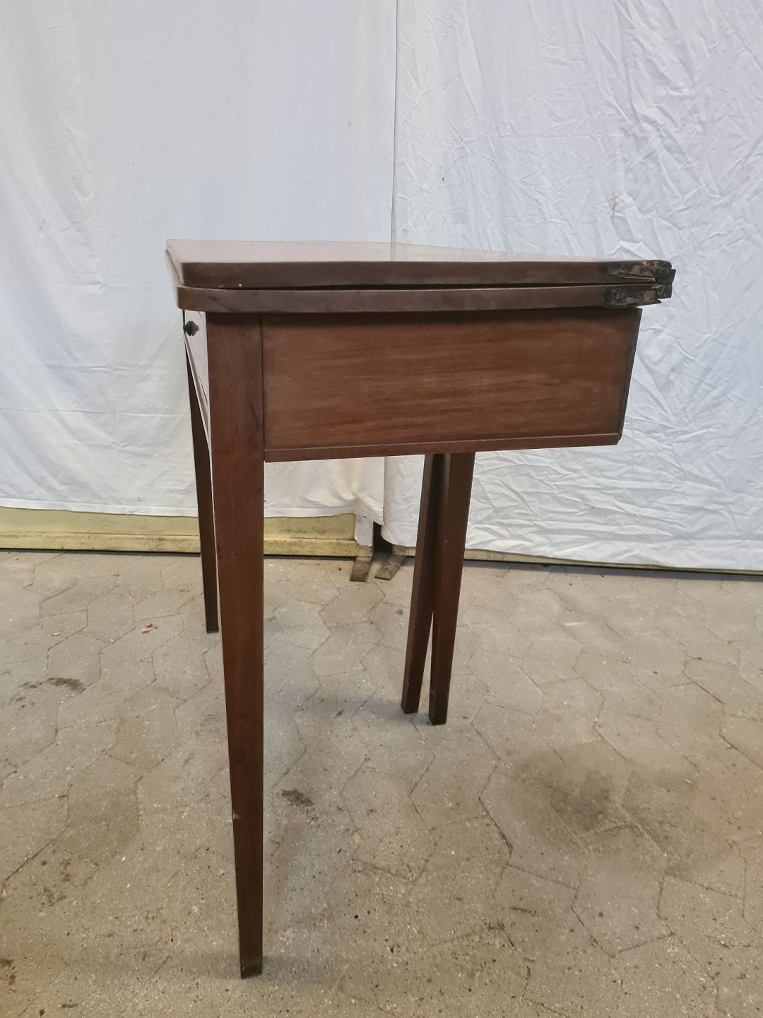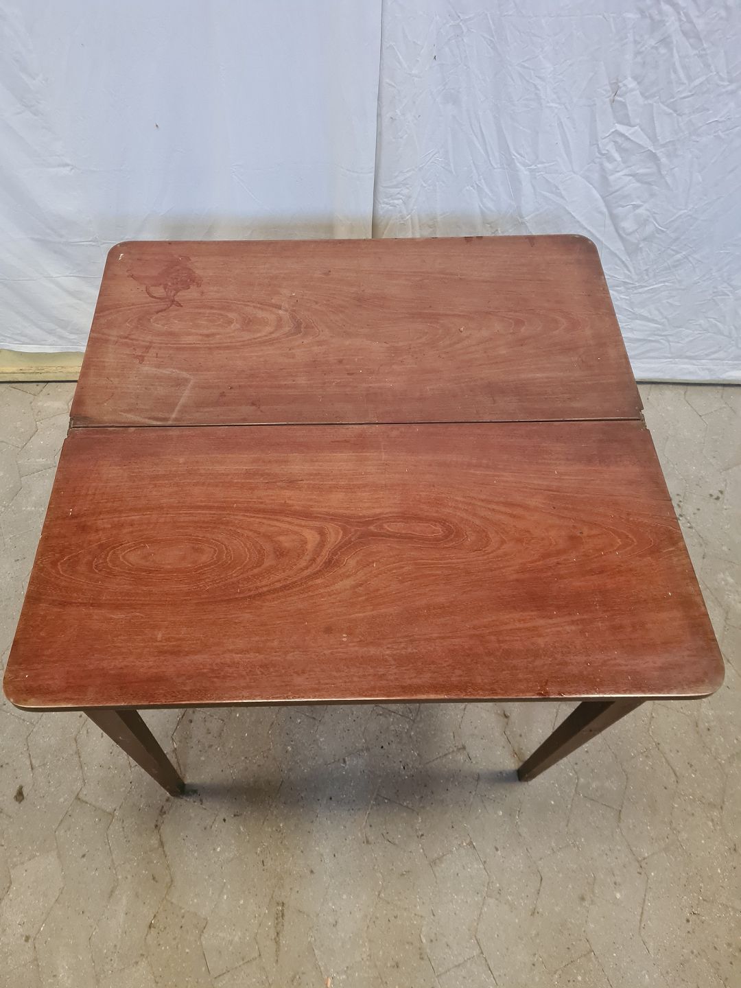 Spillebord i fineret mahogni, fra 1900erne. Det har brugsspor og bagbenene er lidt skæve. Højde 78cm Bredde 44cm Længde 89cm Bredde udslået 88cm Emne nummer: 90945