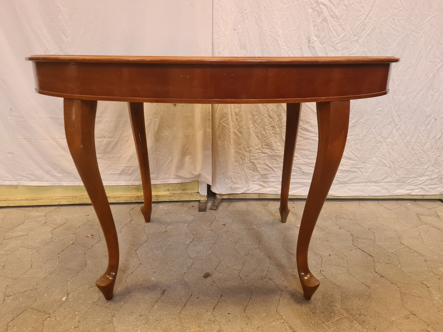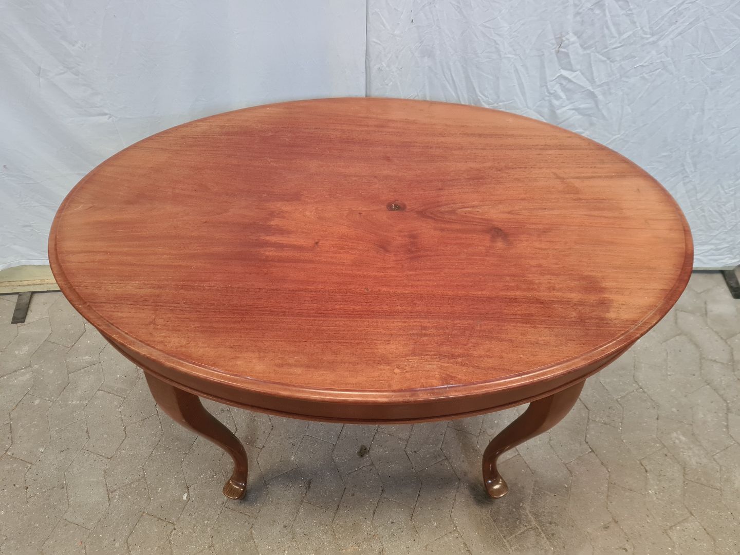 Ovalt salonbord i massivt mahogni og bøgetræ, fra 1910erne. Det har brugsspor. Højde 78cm Bredde 82cm Længde 122cm Emne nummer: 90951