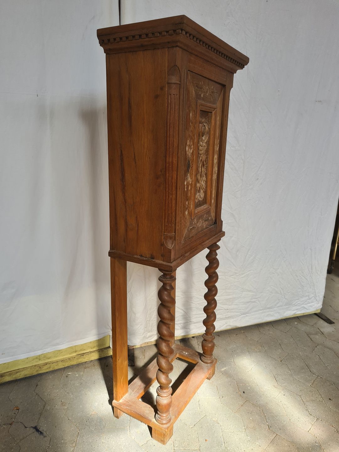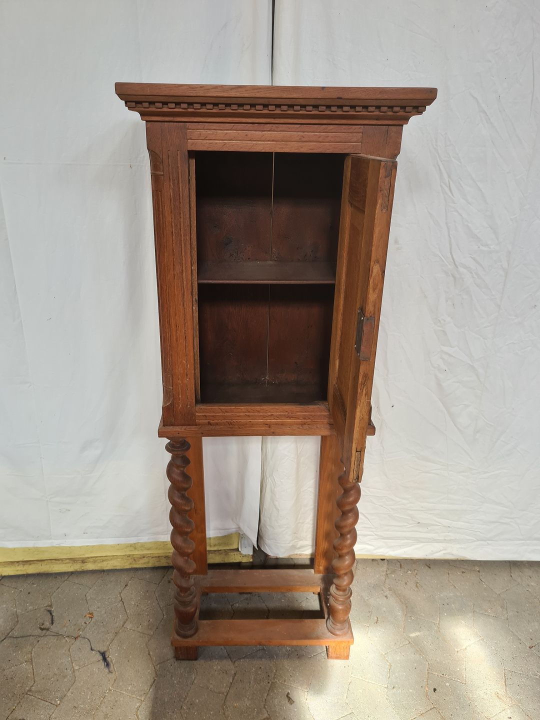 Skab i massivt egetræ, fra 1900erne. Det har brugsspor. Højde 140cm Bredde 54cm Dybde 29cm Emne nummer: 90968