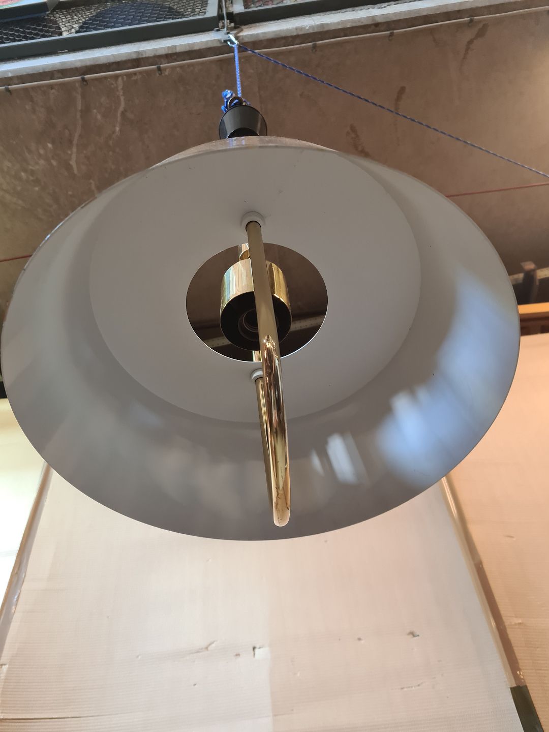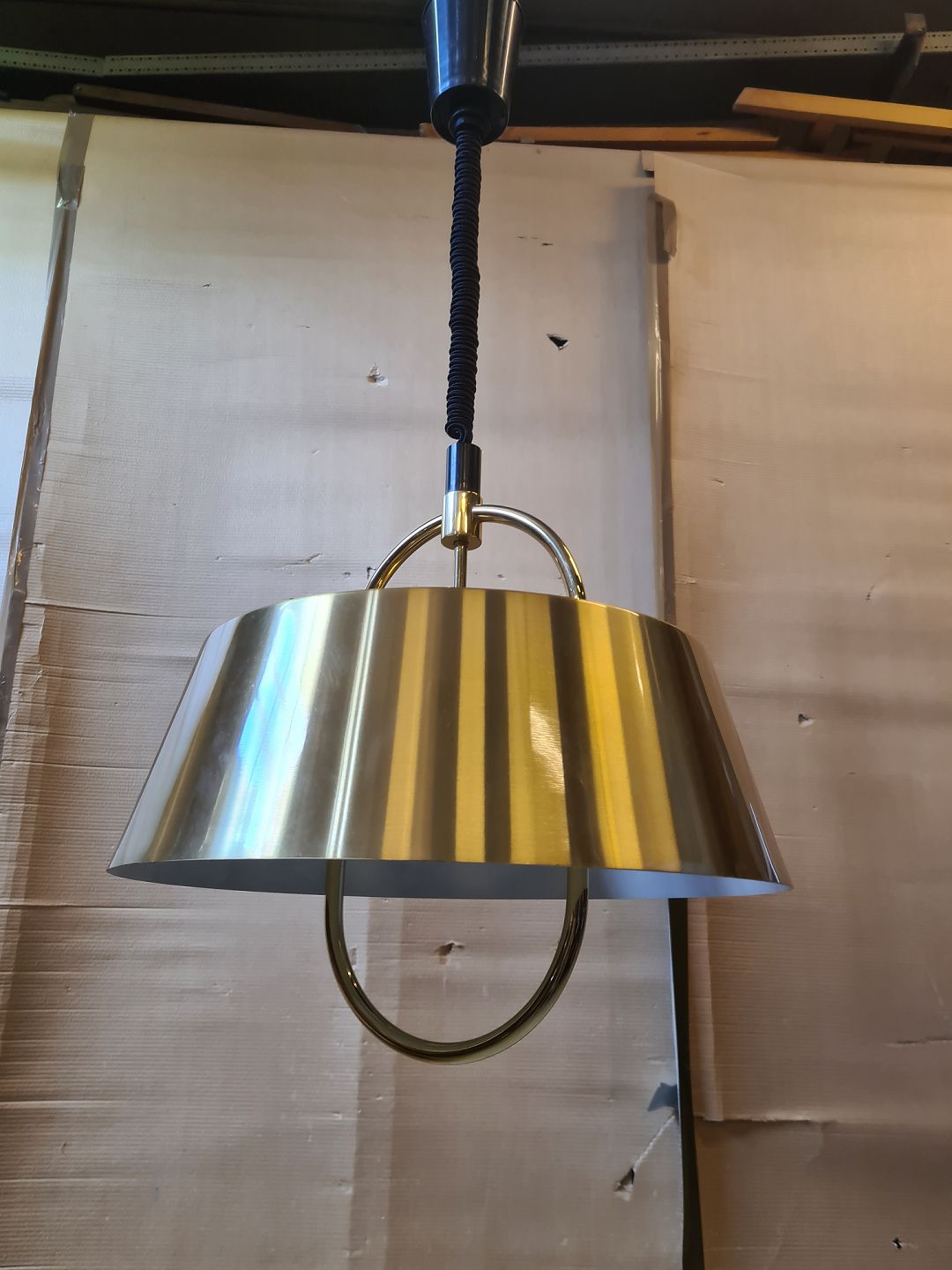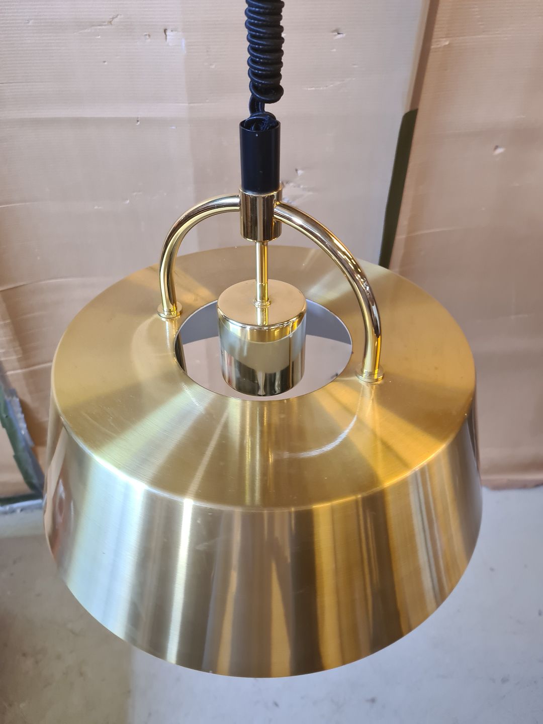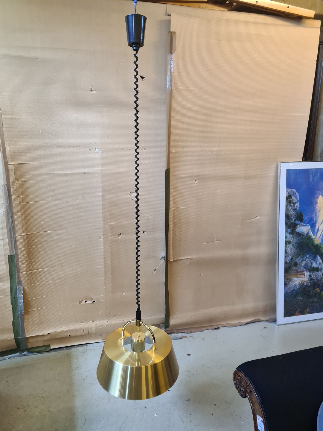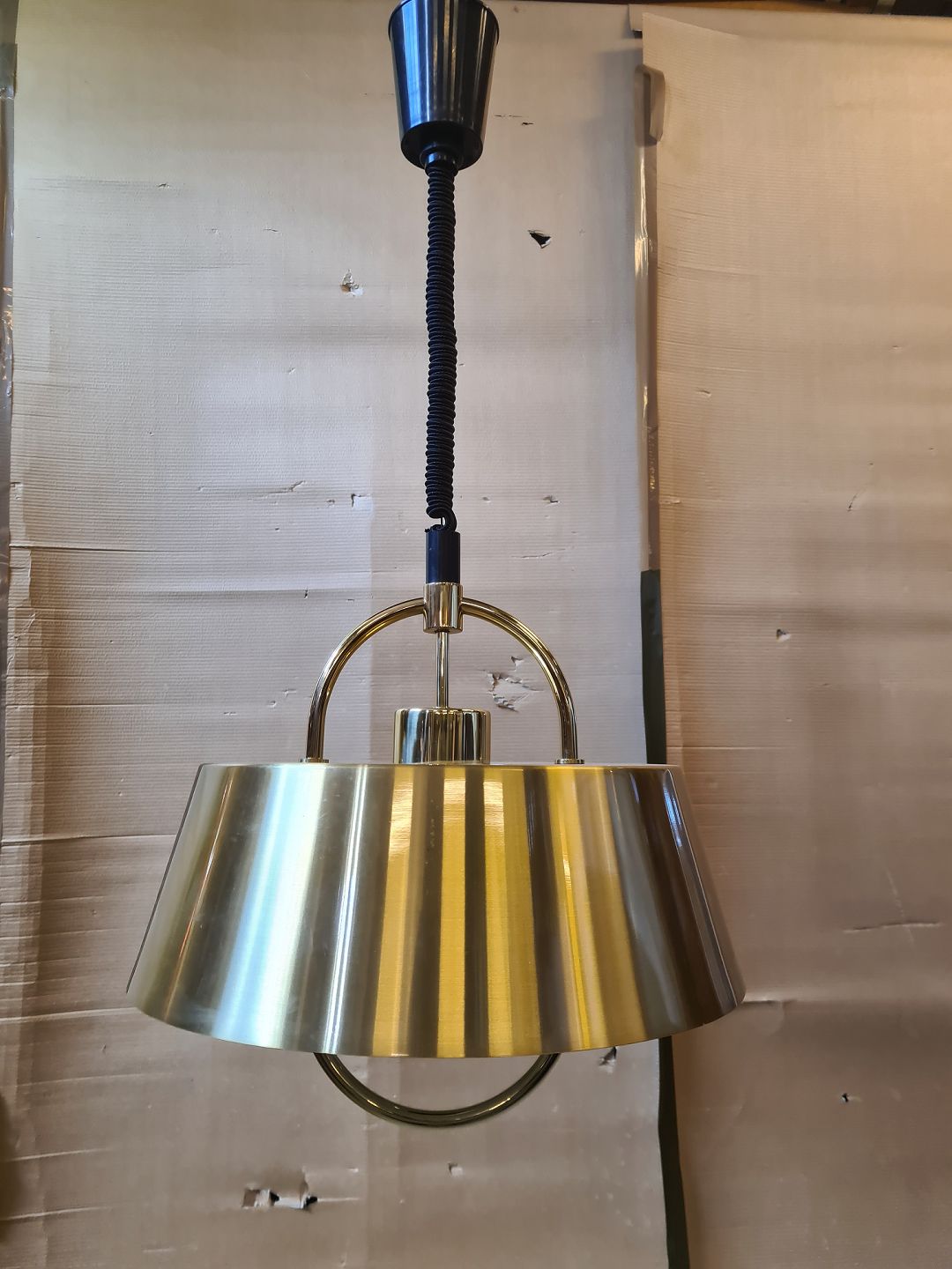 Loftlampe i metal med variabel højde, fra 1990erne. Den har små brugsspor. Højde fra 86cm til 173cm Diameter 42cm Emne nummer: 75906