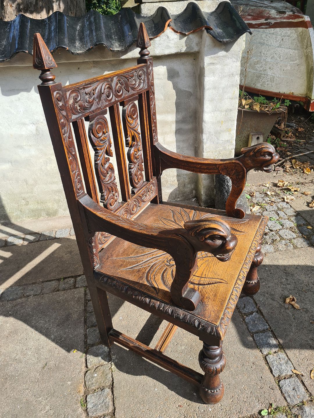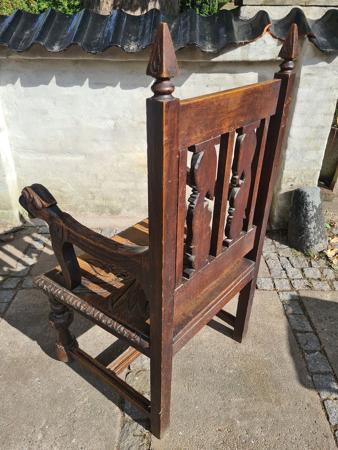 Kongearmstol fra 1920´erne i eg med udskæringer. Fremstår pæn og velholdt uden nævneværdige brugsspor. Højde 122 cm. Bredde 66 cm. Dybde 54 cm. Sædehøjde 45 cm Emne nummer: 80583