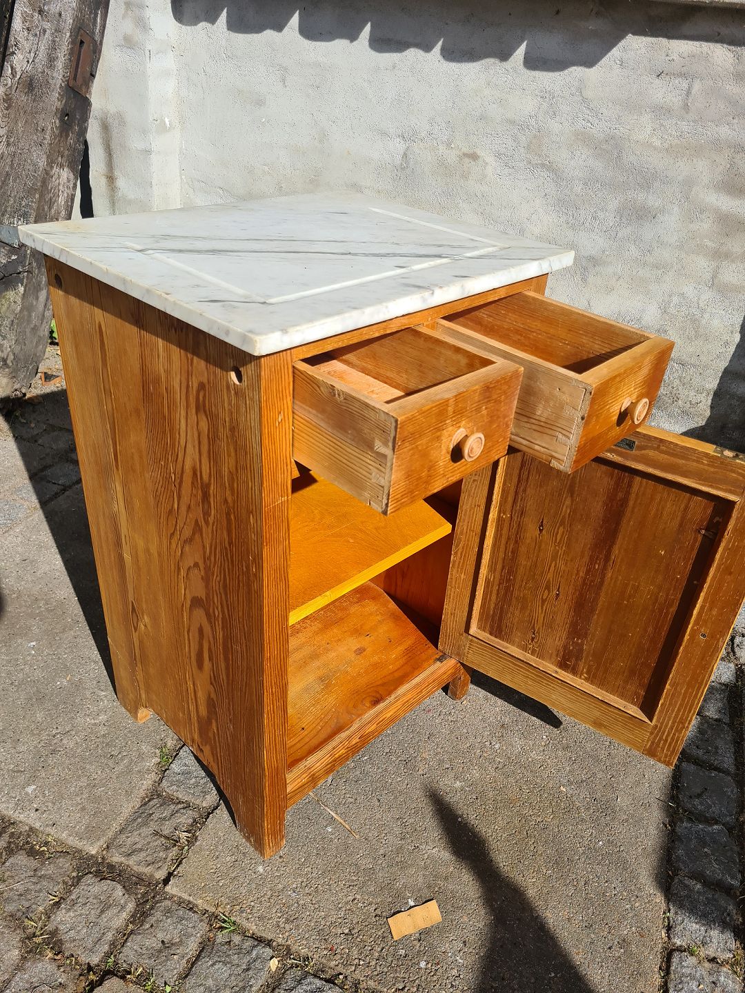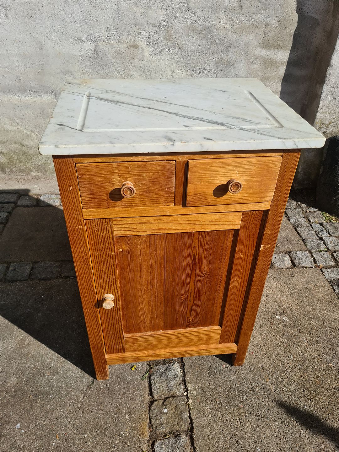 Servante fra 1920´erne i fyr og med mamor. Fremstår pæn, velholdt og funktionsdygtig. Dog med to huller øverst lige under mamorpladen i venstre side. (billede) Højde 76 cm. Bredde 50 cm. Dybde 40 cm. Emne nummer: 80584
