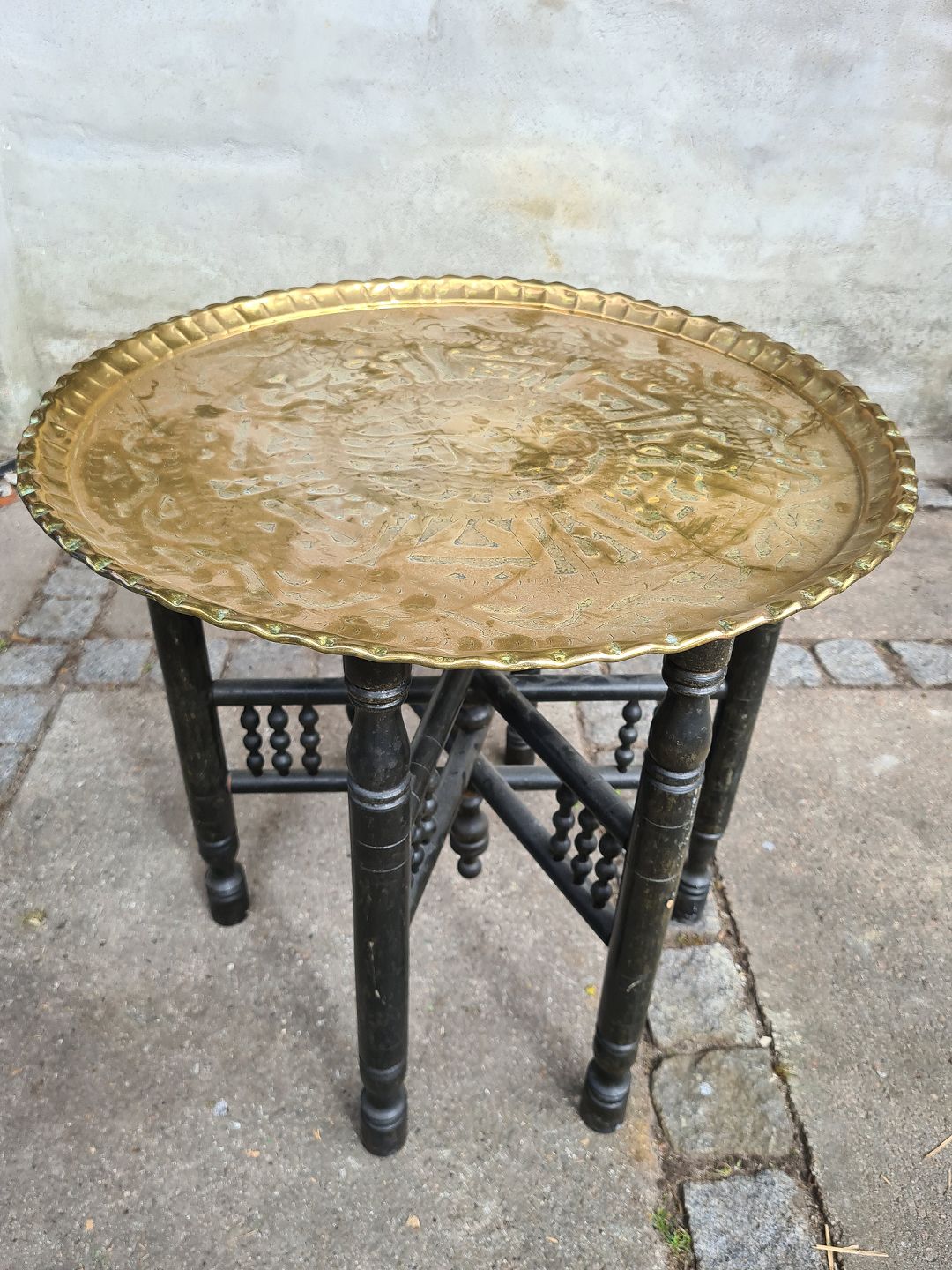 Bakkebord fra 1950´erne med messingplade. Fremstår pænt og udmærket funktionsdygtigt uden de store brugsspor. Højde 52 cm. Diameter 54 cm. Emne nummer: 80594