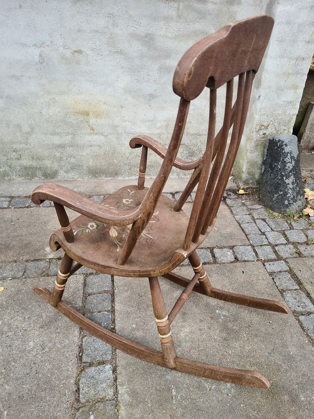Malet gyngestol i børnestørrelse fra 1920'erne. Fremstår pæn, velholdt og udmærket stabil. Højde 90 cm. Bredde 45 cm. Dybde 75 cm. Sædehøjde 34 cm. Emne nummer: 80608