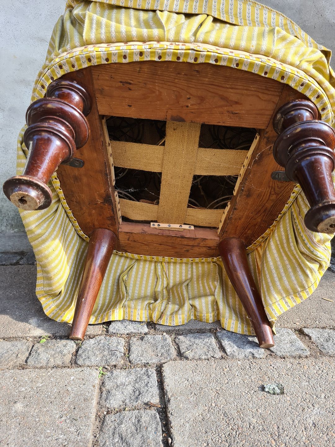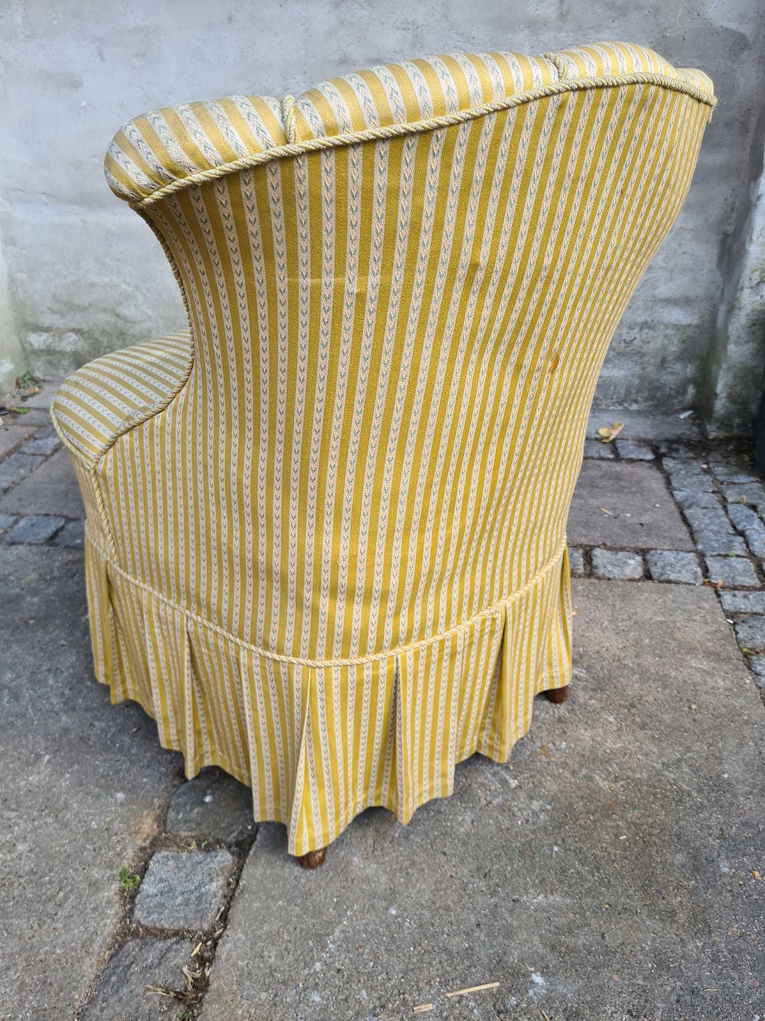 Overpolstret salonlænestol fra 1930'erne. Fremstår pæn og velholdt uden de store brugsspor på stoffet. Derudover udmærket stabil. Højde 75 cm. Bredde 54 cm. Dybde 64 cm. Sædehøjde 44 cm. Emne nummer: 80619