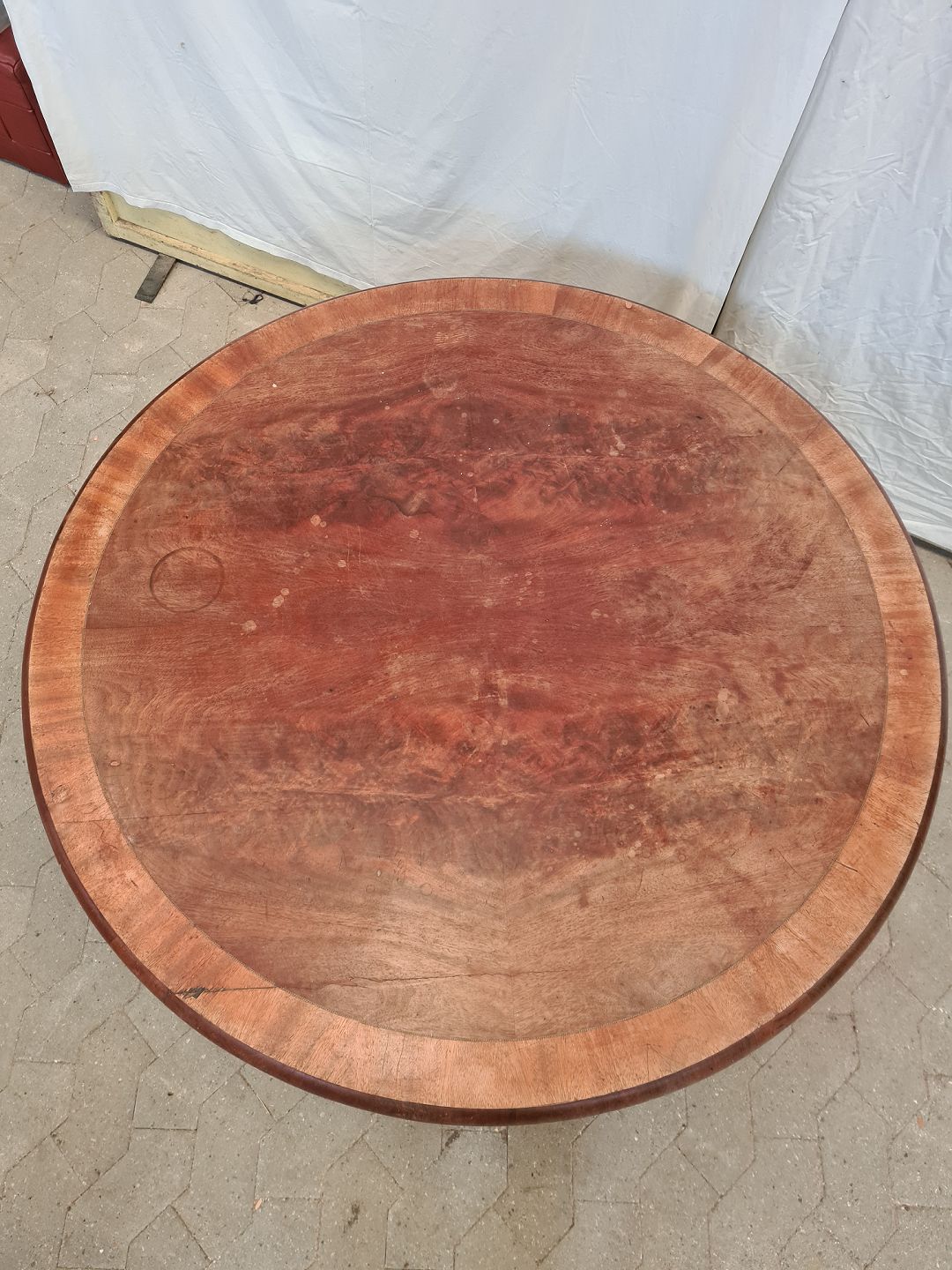 Sofabord i fineret mahogni, fra 1900erne. Det har brugsspor. Højde 56cm Diameter 110cm Emne nummer: 90986