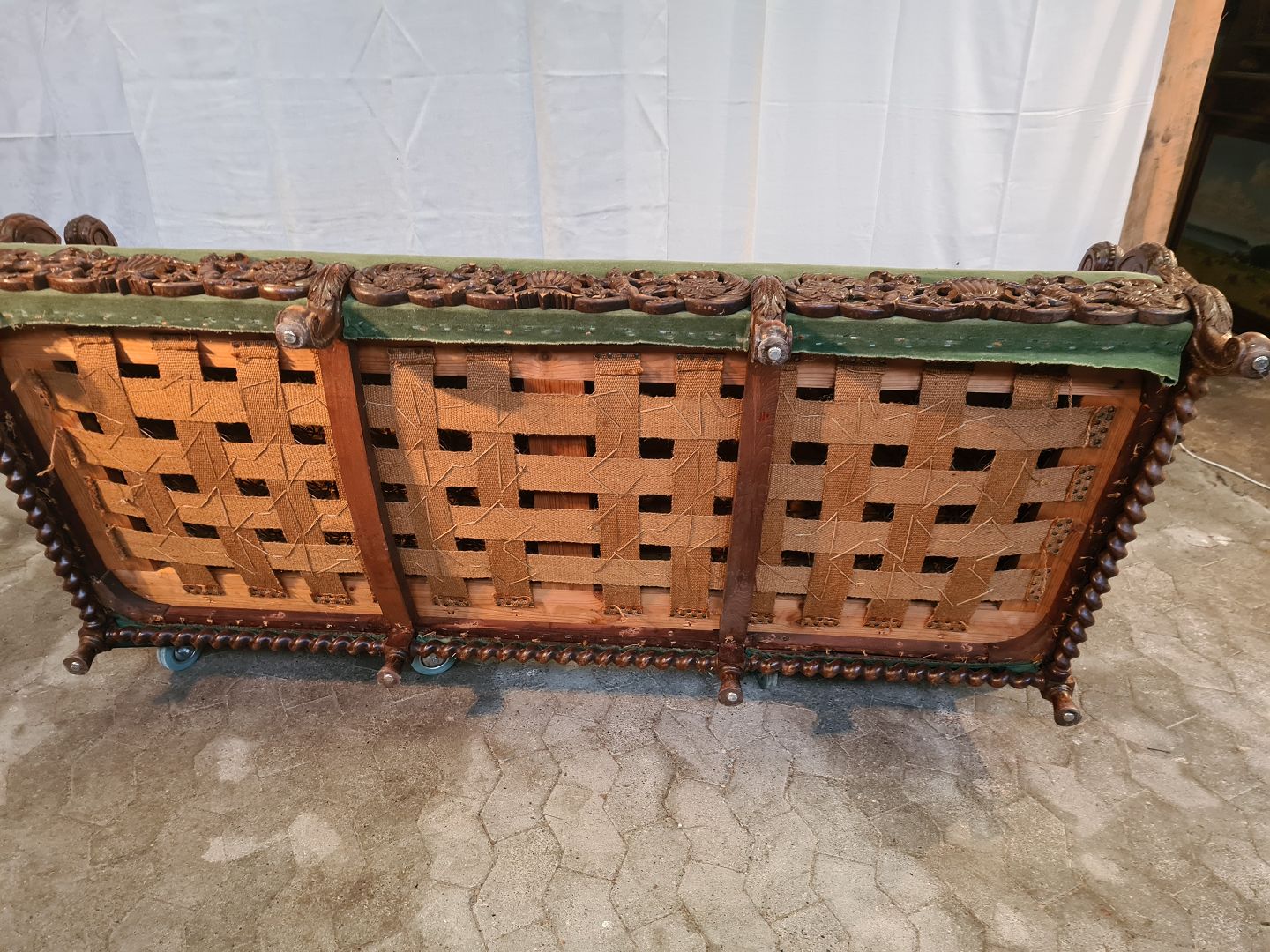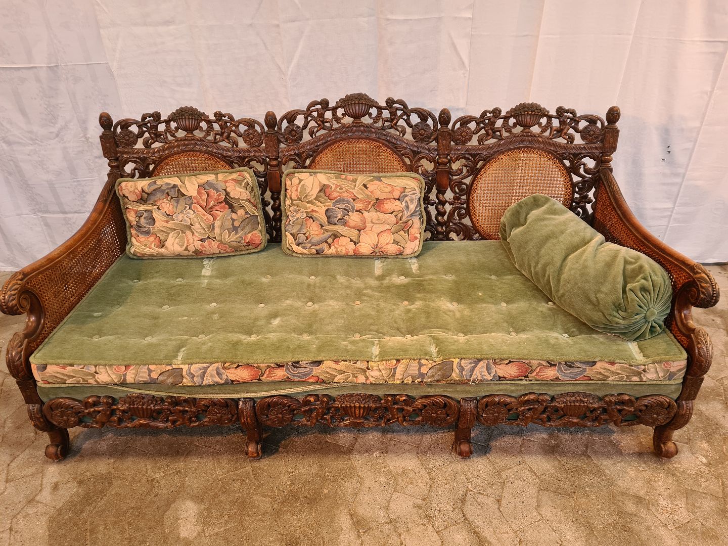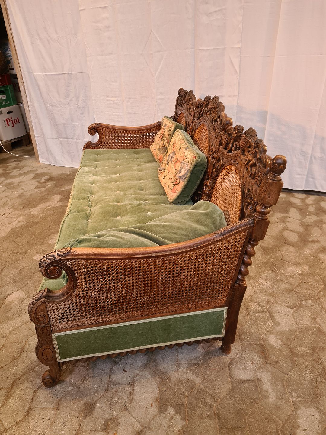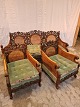 Sofa med 2 lænestole i massivt egetræ og rørflet, fra 1930erne. Det har patina, men betrækket her slid. Ryghøjde 88cm Sædehøjde 43cm Sofa bredde 200cm Dybde 84cm Emne nummer: 91020
