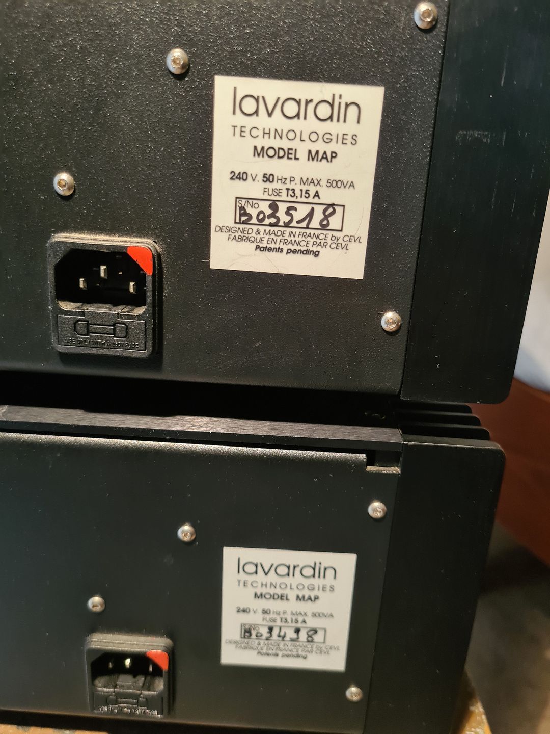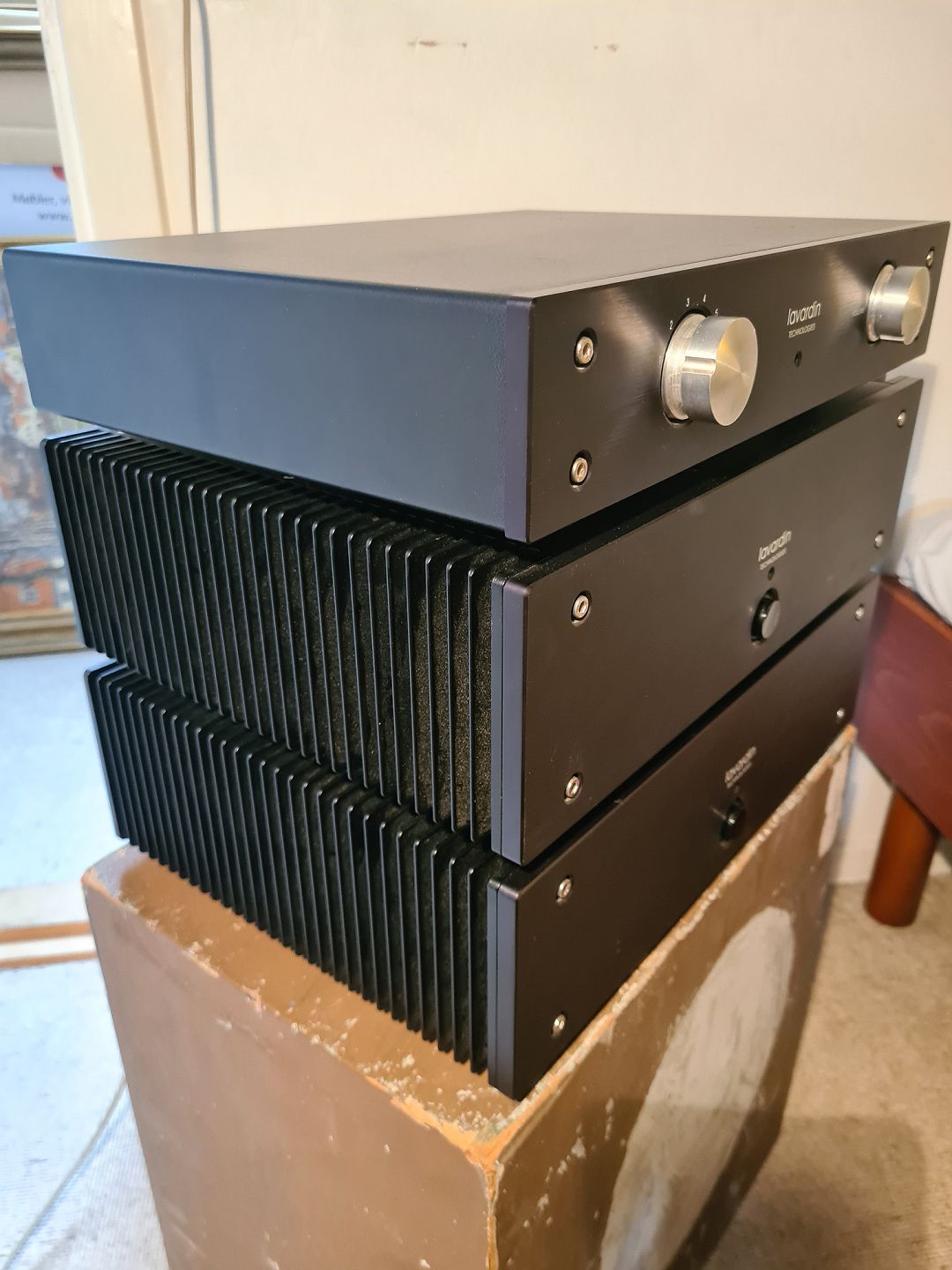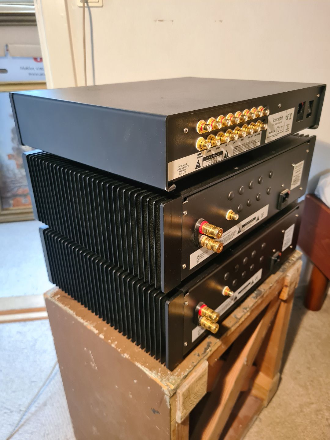 Forstærkersæt fra franske Lavardin Technologies bestående af 2 stk. mono effektforstærkere model MAP og forforstærker model C 62. Sættet er brugt sammen og omkring 9 år gammelt. Virker som det skal. Dog synes en anelse knasen når volumen opereres og phono indgang at brumme lidt mere end de andre indgange på C 62. Medføger strømførende kabler og originalt emballage.
