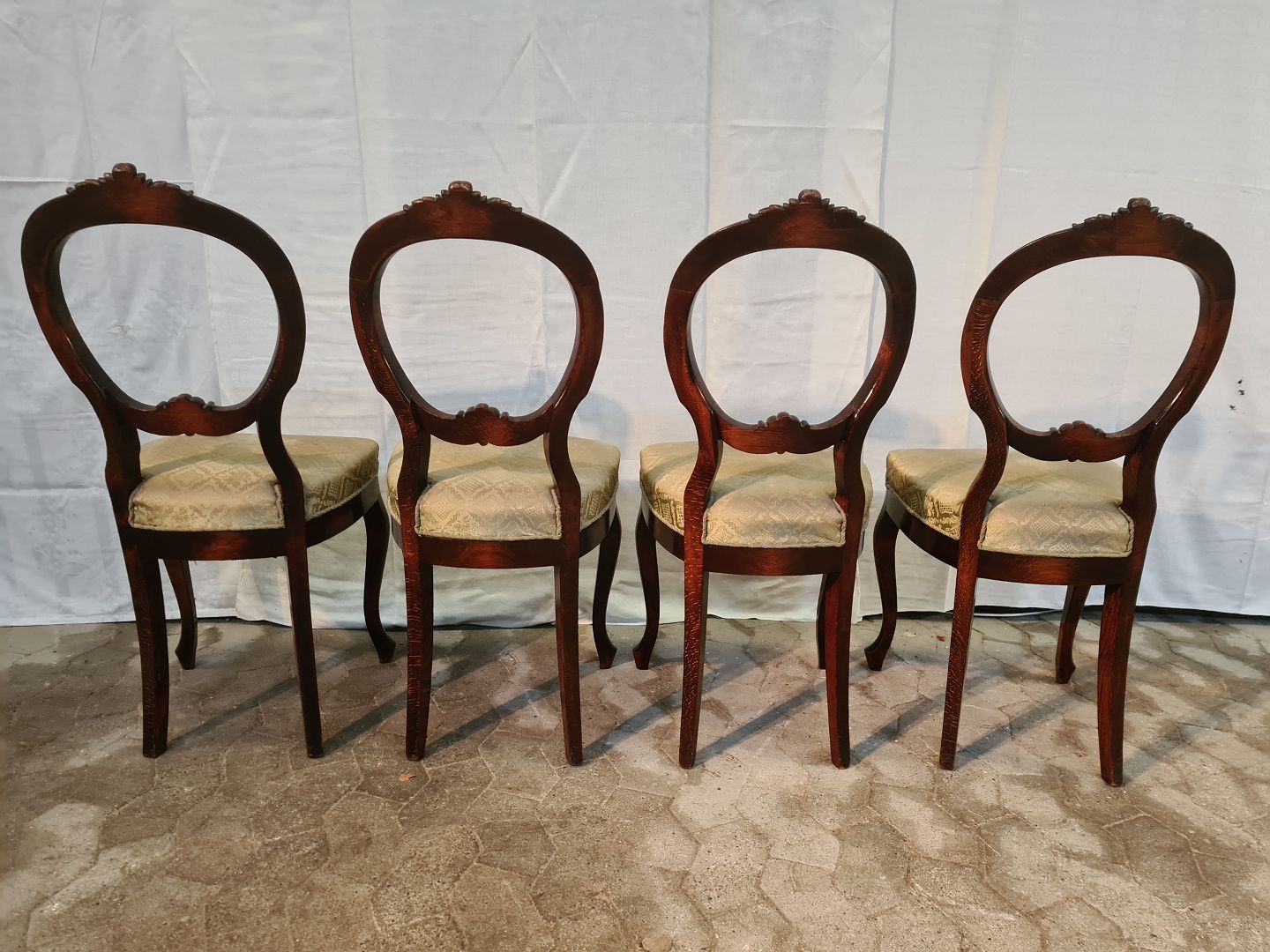4 Salonstole i bøgetræ, fra 1910erne. Betrækket har slid. Ryghøjde 95cm Sædehøjde 48cm Emne nummer: 91025
